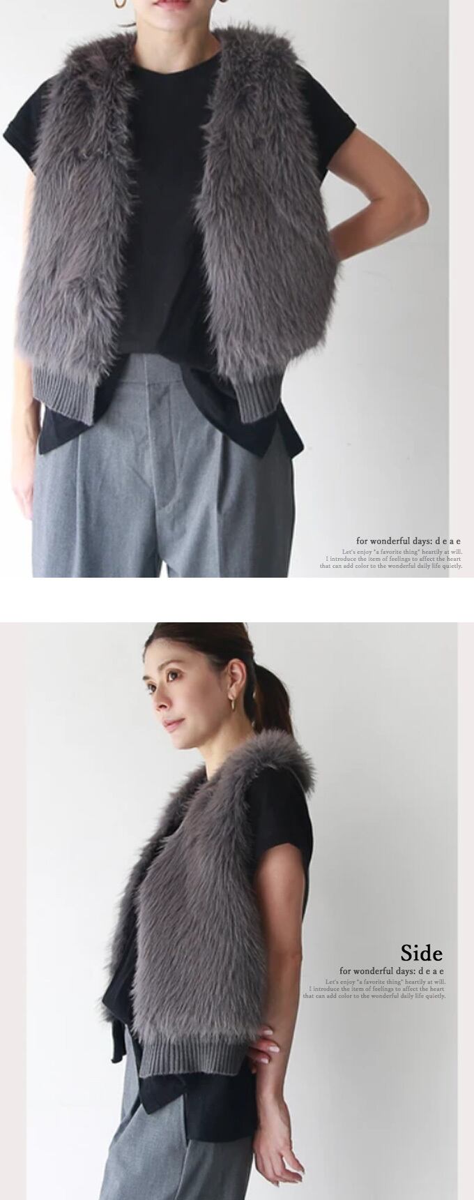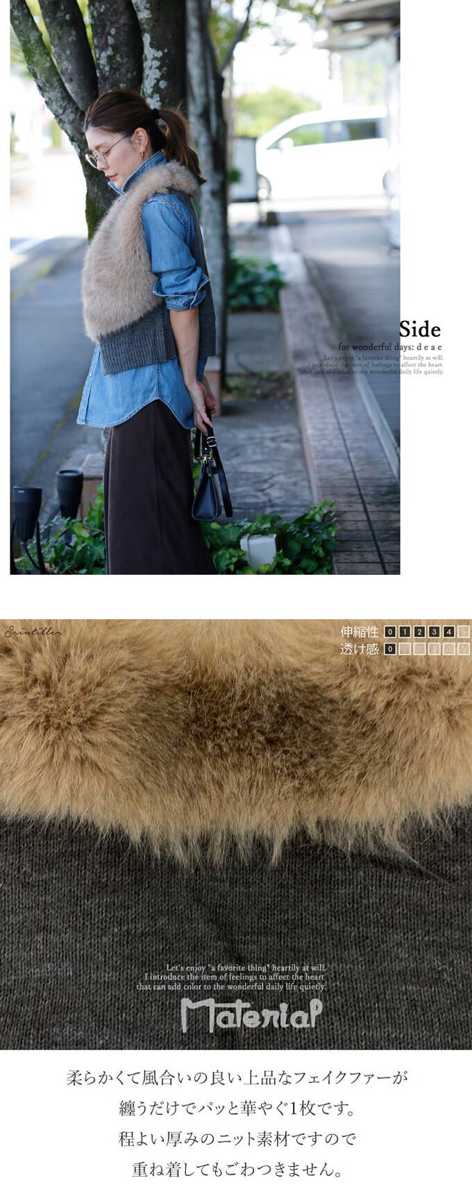 【検索ワード】 フェイクファー ニットベスト エコファー 上品 華やか 大人カジュアル 「重ねるだけでパッと華やぐ 上品フェイクファーのニットベスト」 エレガント ベーシック カジュアル おしゃれ オシャレ お洒落 定番 ベーシック 上品 女性らしい デザイン きれいめ キレイめ シンプル フェミニン 春 秋 春服 春物 秋 冬 冬物 着回し レディース レディースファッション 大人 ママ 30代 40代 50代 60代 フェイクファー ベスト グレー ベージュ カーキ