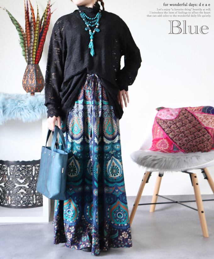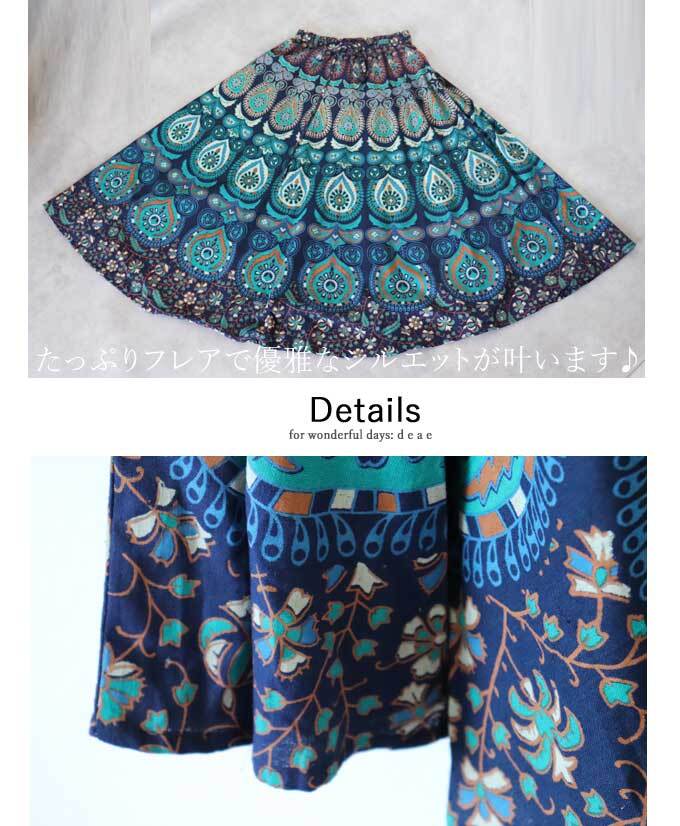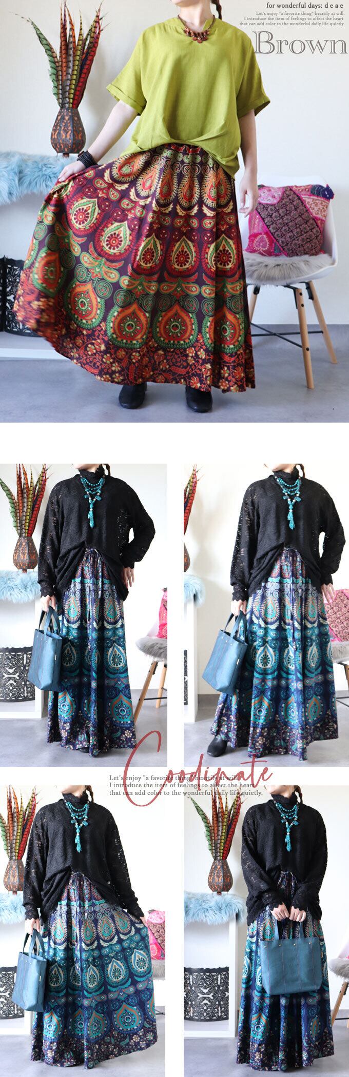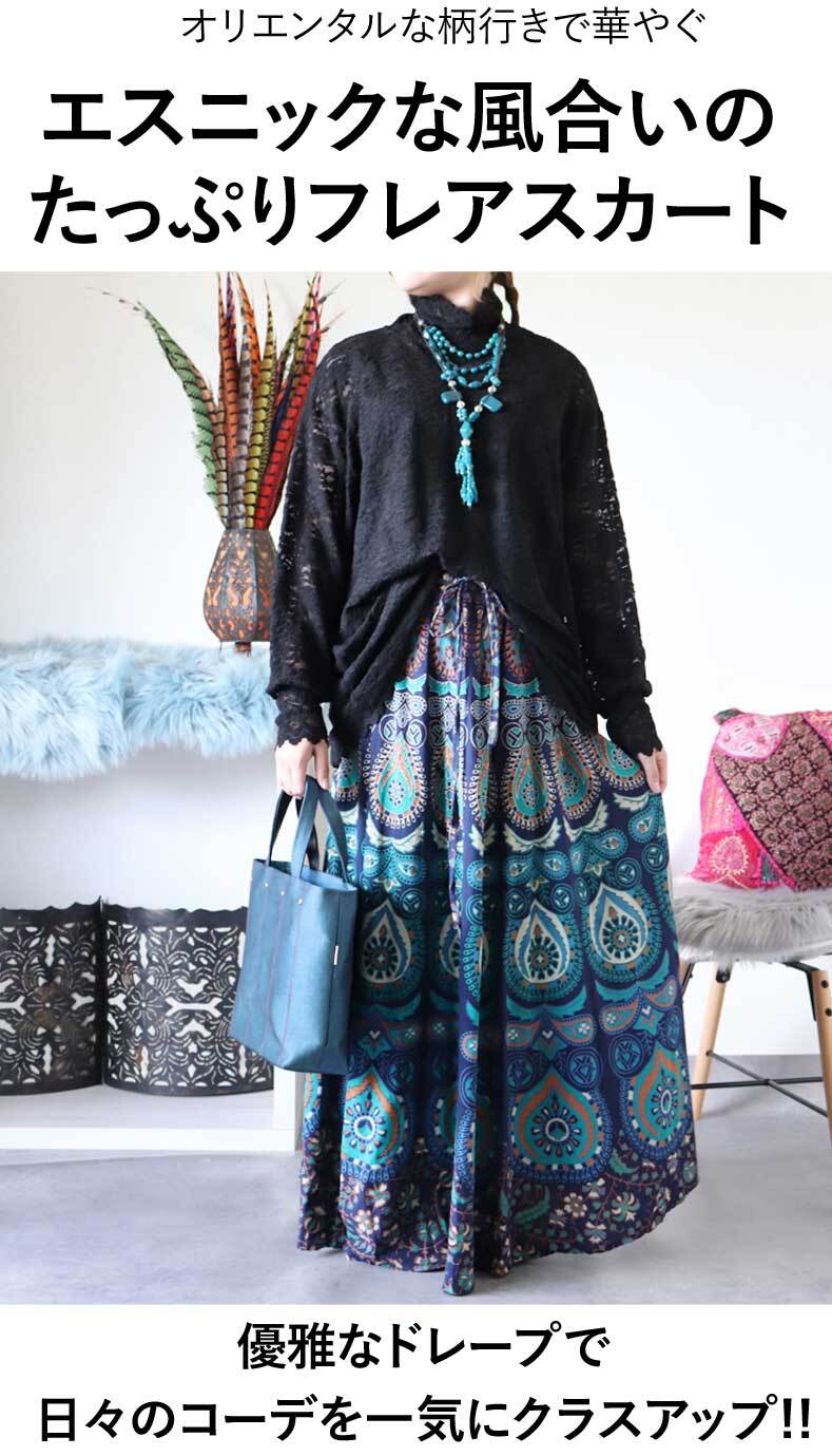 スカート フレア ロング丈 総柄 ボヘミアン アジアンテイスト ドレープ レディース 夏 春 秋 冬 ファッション オリエンタル エスニック カジュアル「彩り豊かに華やぐ オリエンタルな風合い たっぷりフレアスカート」dc10299