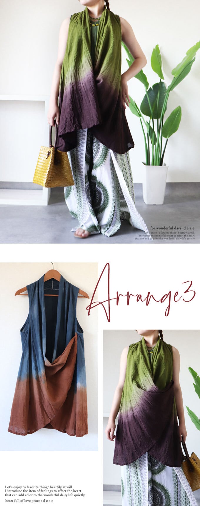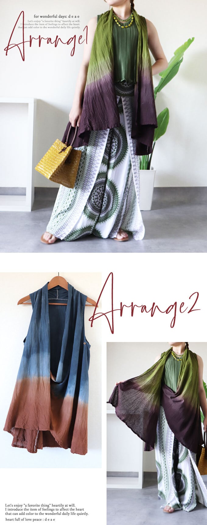 トップス 羽織り ロング丈 ミディアム丈 ノースリーブ バイカラー タイダイ染め 3WAY ドレープ レイヤード レディース 夏 春 秋 ファッション 着回し カジュアル エスニック アジアン オリエンタル「日々のコーデに大人ナチュラルをプラス ゆるり華やぐレイヤード羽織り」da10490