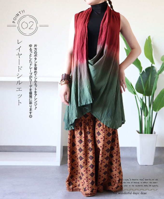 【検索ワード】トップス 羽織り ロング丈 ミディアム丈 ノースリーブ バイカラー タイダイ染め 3WAY ドレープ レイヤード レディース 夏 春 秋 ファッション 着回し カジュアル エスニック アジアンスタイル オリエンタル「日々のコーデに大人ナチュラルをプラス ゆるり華やぐレイヤード羽織り」エレガント ベーシック カジュアル おしゃれ オシャレ お洒落 定番 ベーシック 上品 女性らしい デザイン きれいめ キレイめ シンプル フェミニン 春 秋 春服 春物 夏 夏物 着回し レディース レディースファッション 大人 ママ ミセス S M L 小さめサイズ小さい 小さいサイズ 低身長 小柄 細身 標準サイズ 大きめシルエット 大きめサイズ 大きめ 大きい ゆったり 綺麗め カジュアル 羽織り ノースリーブ 30代 40代 50代 60代