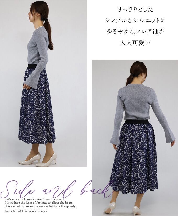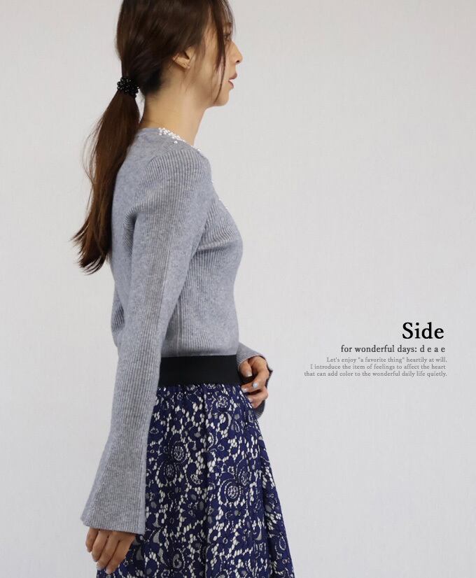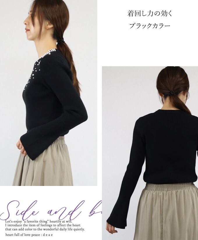 トップス 長袖 カットソー リブ フレア袖 パール ビジュー 装飾 華やか フェミニン 上品 着回し レディース 春 秋 冬 ファッション カジュアル 綺麗め「デコルテに散りばめられた凛と煌めくパールビジューの フレア袖カットソー」da10522