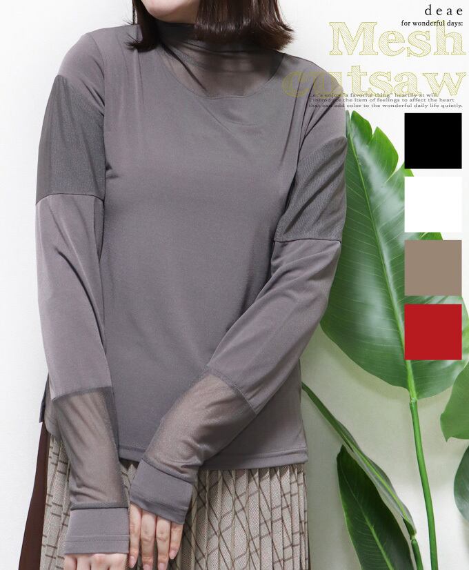 【検索ワード】トップス 長袖 カットソー メッシュ 切り替え インナーにも 着回し レディース 春 秋 冬 ファッション カジュアル 大人モード「1枚でも重ね着のインナーにも 着回し力抜群のメッシュ切り替え長袖カットソー」エレガント ベーシック カジュアル おしゃれ オシャレ お洒落 定番 ベーシック 上品 女性らしい デザイン きれいめ キレイめ シンプル フェミニン 春 秋 春服 春物 夏 夏物 着回し レディース レディースファッション 大人 ママ ミセス S M L 小さめサイズ小さい 小さいサイズ 低身長 小柄 細身 標準サイズ 大きめシルエット 大きめサイズ 大きめ 大きい ゆったり 綺麗め カジュアル メッシュ 切り替え 長袖カットソー 30代 40代 50代 60代 ブラック モカグレー ホワイト レッド