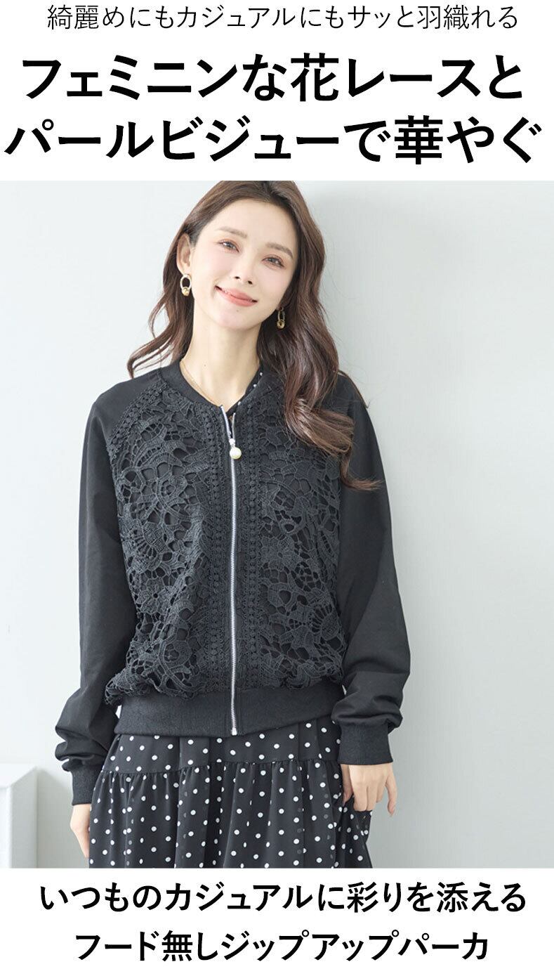 【検索ワード】トップス フード無し ジップアップパーカ ブルゾン アウター スウェット 羽織り 花レース パールビジュー レディース 春 秋 冬 ファッション 上品 カジュアル 綺麗めフェミニン「カジュアルにフェミニンな華やぎを添えてくれる 繊細花レースのジップアップ」エレガント ベーシック カジュアル おしゃれ オシャレ お洒落 定番 ベーシック 上品 女性らしい デザイン きれいめ キレイめ シンプル フェミニン 春 秋 春服 春物 夏 夏物 着回し レディース レディースファッション 大人 ママ ミセス S M L 小さめサイズ小さい 小さいサイズ 低身長 小柄 細身 標準サイズ 大きめシルエット 大きめサイズ 大きめ 大きい ゆったり 綺麗め カジュアル フード無し ジップアップパーカー 30代 40代 50代 60代 ブラック オフホワイト グレー ネイビー
