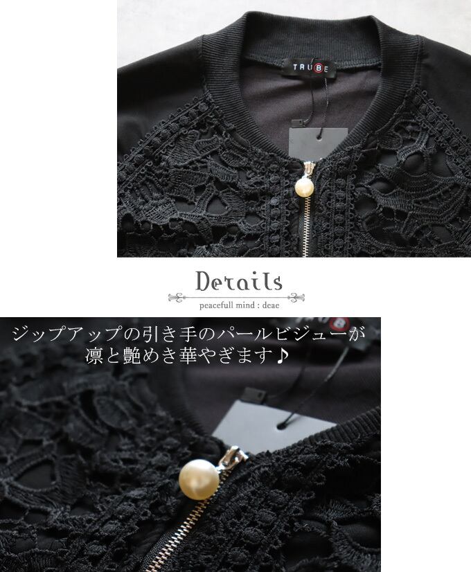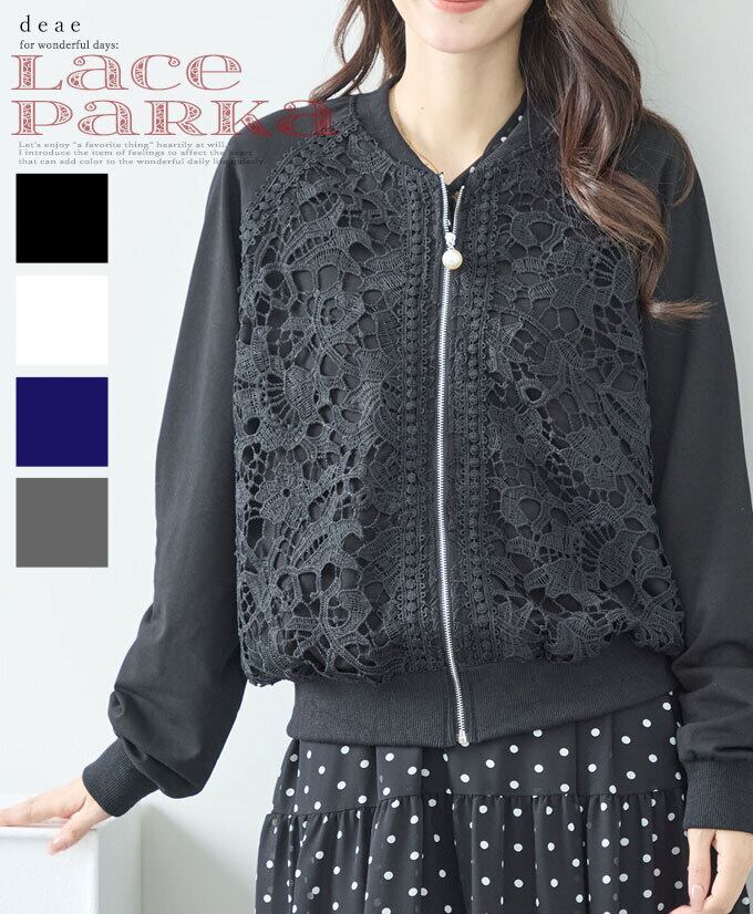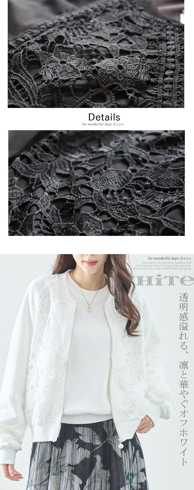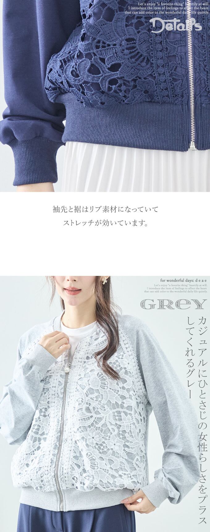 トップス フード無し ジップアップパーカ ブルゾン アウター スウェット 羽織り 花レース パールビジュー レディース 春 秋 冬 ファッション 上品 カジュアル 綺麗めフェミニン「カジュアルにフェミニンな華やぎを添えてくれる 繊細花レースのジップアップ」da10524