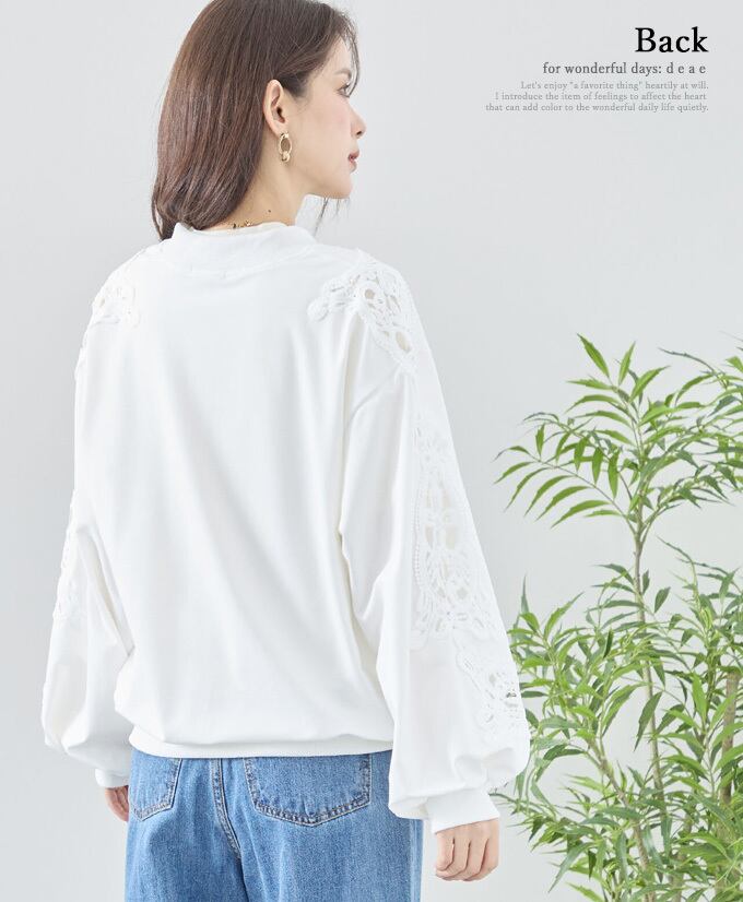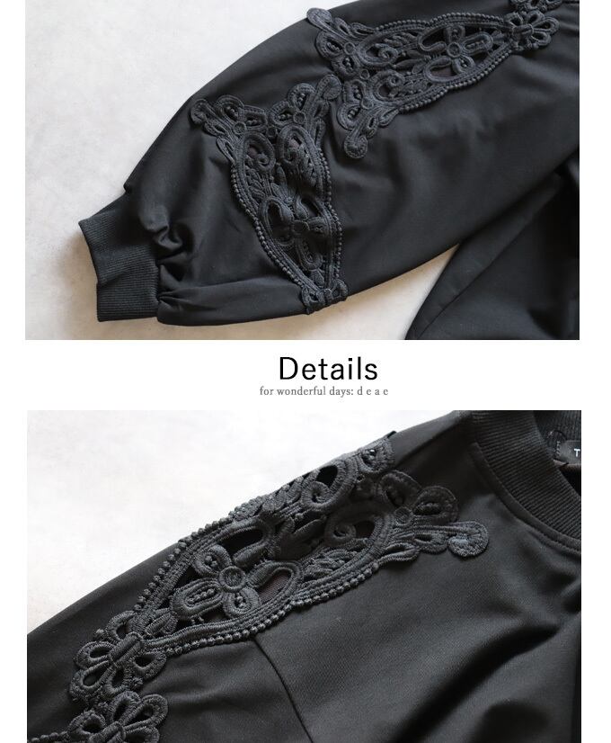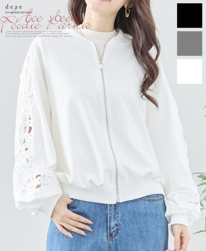 トップス 長袖 パテンレース風 ふんわり袖 フロントジップアップ フード無しパーカー 引手パールビジュー レディース 春 秋 冬 ファッション 上品 カジュアル 綺麗めフェミニン「パテン調レースがフェミニンに華やぐ フード無しパーカー」da10527