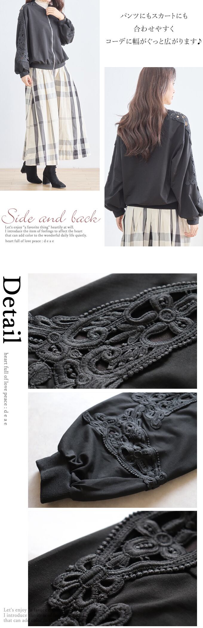 【検索ワード】トップス 長袖 パテンレース風 ふんわり袖 フロントジップアップ フード無しパーカー 引手パールビジュー レディース 春 秋 冬 ファッション 上品 カジュアル 綺麗めフェミニン「パテン調レースがフェミニンに華やぐ フード無しパーカー」エレガント ベーシック カジュアル おしゃれ オシャレ お洒落 定番 ベーシック 上品 女性らしい デザイン きれいめ キレイめ シンプル フェミニン 春 秋 春服 春物 夏 夏物 着回し レディース レディースファッション 大人 ママ ミセス S M L 小さめサイズ小さい 小さいサイズ 低身長 小柄 細身 標準サイズ 大きめシルエット 大きめサイズ 大きめ 大きい ゆったり 綺麗め カジュアル フード無しパーカー 30代 40代 50代 60代 グレー ブラック オフホワイト