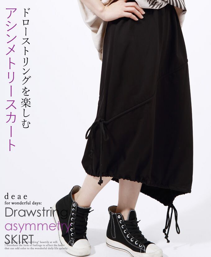 スカート ひざ丈 秋冬 アシンメトリースカート レディース ファッション ブラック 春 夏 秋 冬 オールシーズン アシンメトリー ドローストリング モード 大人 カジュアル お洒落 可愛い 着回し オシャレ 「ドローストリングを楽しむアシンメトリースカート」pb60511