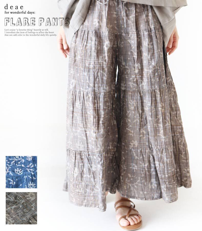 ワイドパンツ ティアード フレアパンツ レディース 夏 春 ファッション オリエンタル エスニック アジアン カジュアル お洒落 可愛い カーキブラウン ネイビー「エスニックな雰囲気を楽しむ ティアード フレアパンツ」dc10115