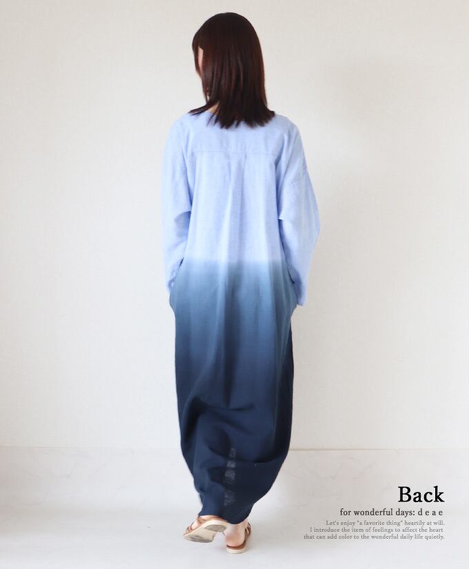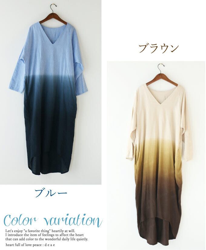 ワンピース 長袖 ロング丈 リネン ブラウン ネイビー グラデーション 後ろ下がり Vネック レディース 夏 春 秋ファッション 大人ナチュラル カジュアル「Vネックと後ろ下がりのヘムラインですっきり見せが叶う リネンワンピース」db10116