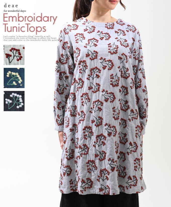 トップス チュニック 長袖 北欧 草木 刺繍 カジュアル レディース ファッション「北欧の草木を映した ぷっくり刺繍が可愛いチュニックトップス」da10168