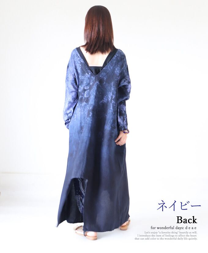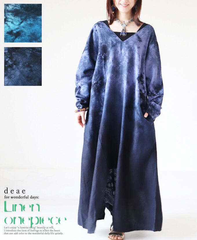 ワンピース 長袖 ロング丈 リネン ブルー ネイビー タイダイ染め イレギュラーヘム Vネック レディース 夏 春 秋ファッション 大人ナチュラル カジュアル「Vネックですっきり イレギュラーヘムのタイダイ染めリネンワンピース」db10117