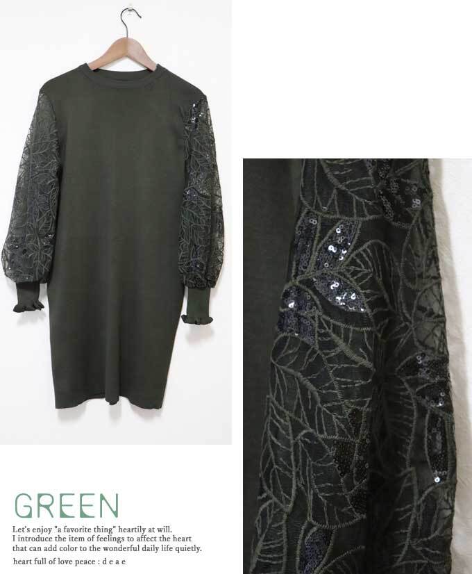 ニット ワンピース ミディアム丈 長袖 ボタニカル柄レース ふんわり袖 シアー 煌めき エレガント 綺麗め カジュアル 上品 チュニック 「煌めくリーフ柄レースのふんわり袖 ニットワンピース」db10124