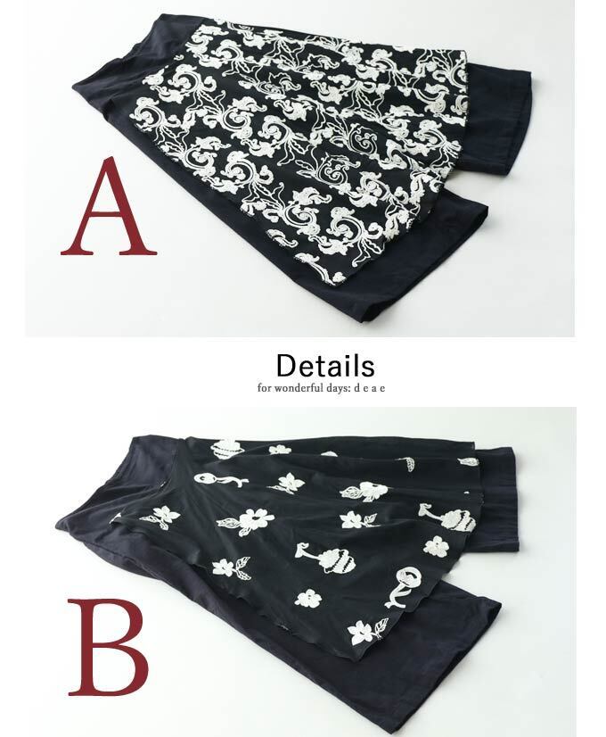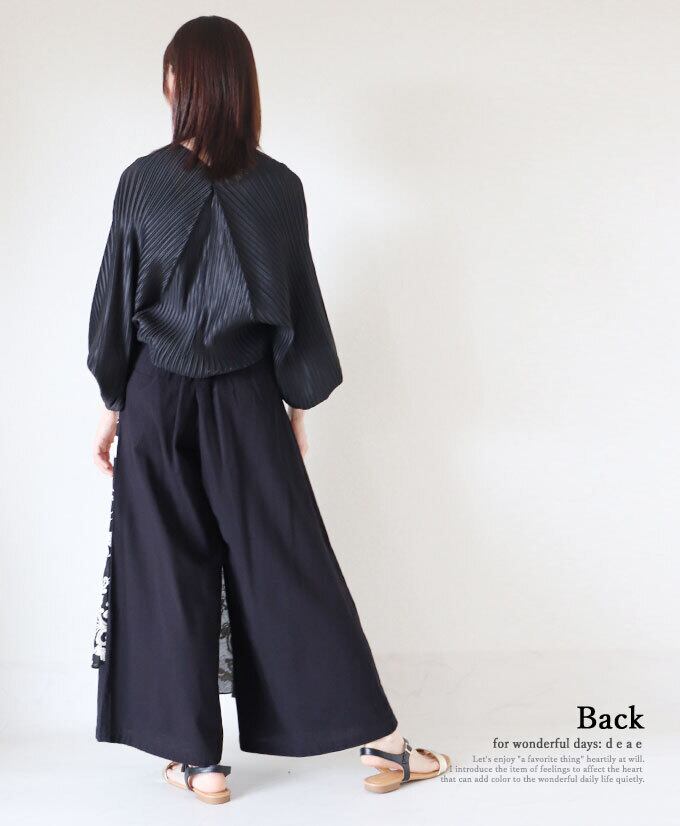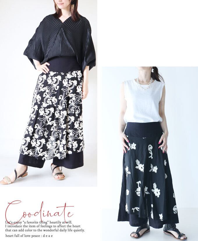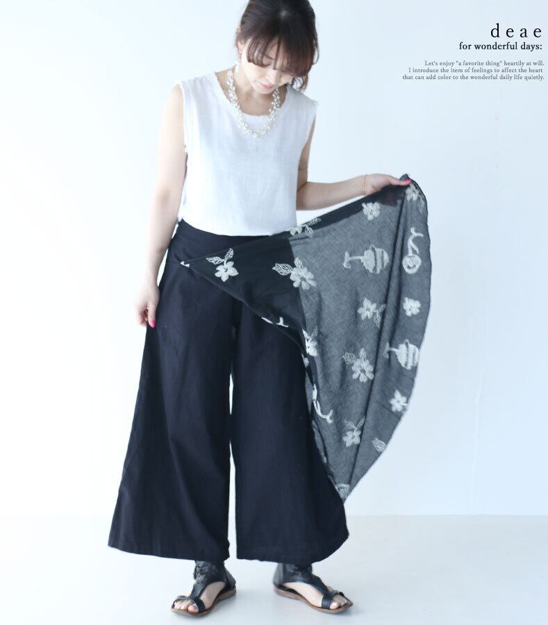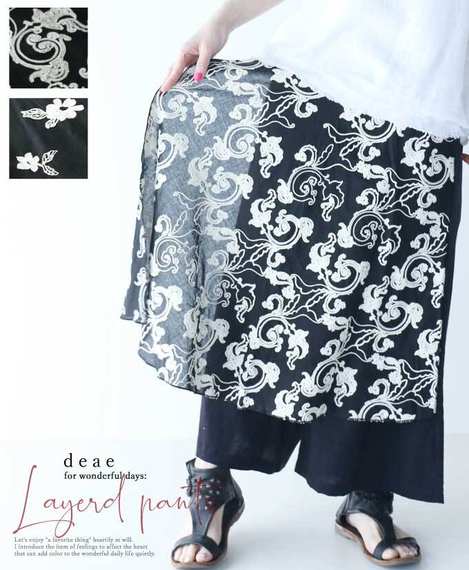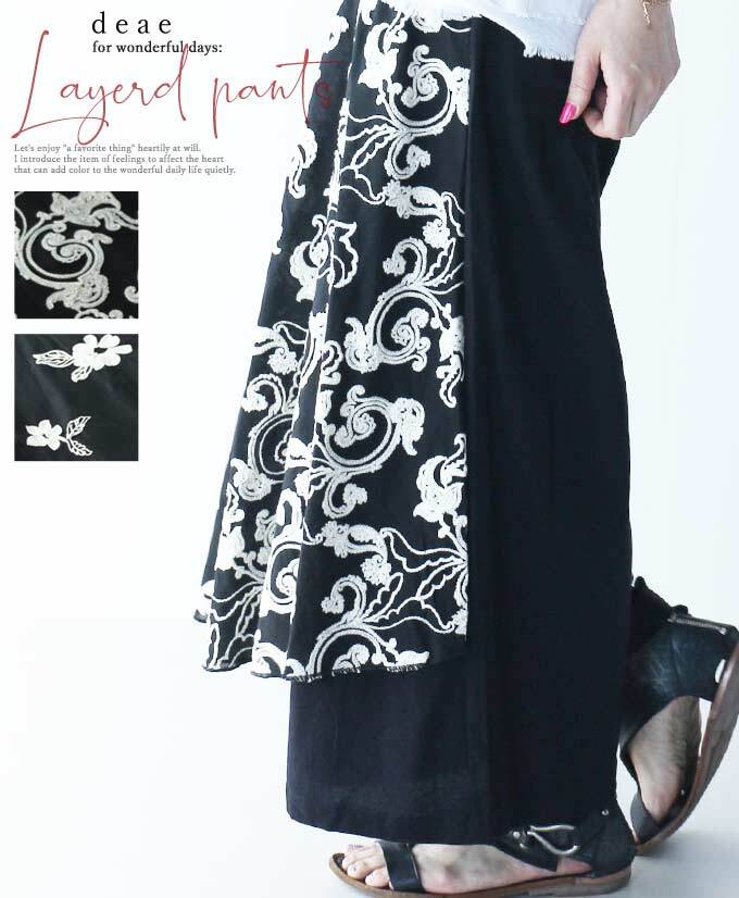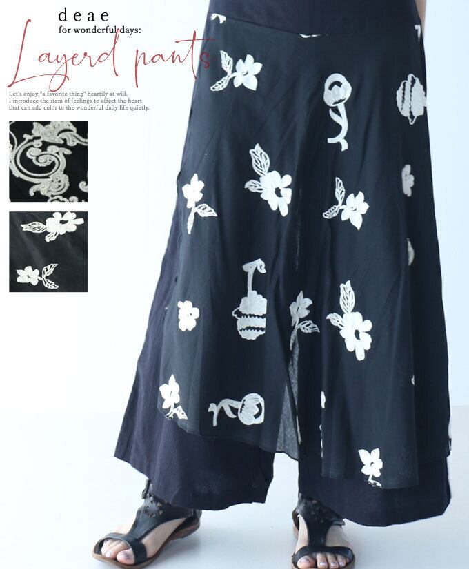 DEAE パンツ ワイド フレア 刺繍 レイヤード モノトーン エスニック オリエンタル 大人カジュアル「1枚で重ね着風 お洒落なカフェパンツ」dc10125