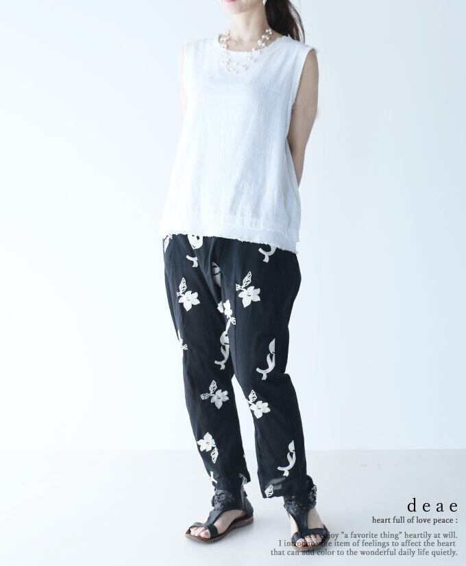 パンツ サルエル 花刺繍 北欧 モノトーン ゆったり レディース 夏 春 ファッション エスニック カジュアル お洒落 可愛い「北欧風 花刺繍が大人可愛い ラフに着映えるサルエルパンツ」dc10120
