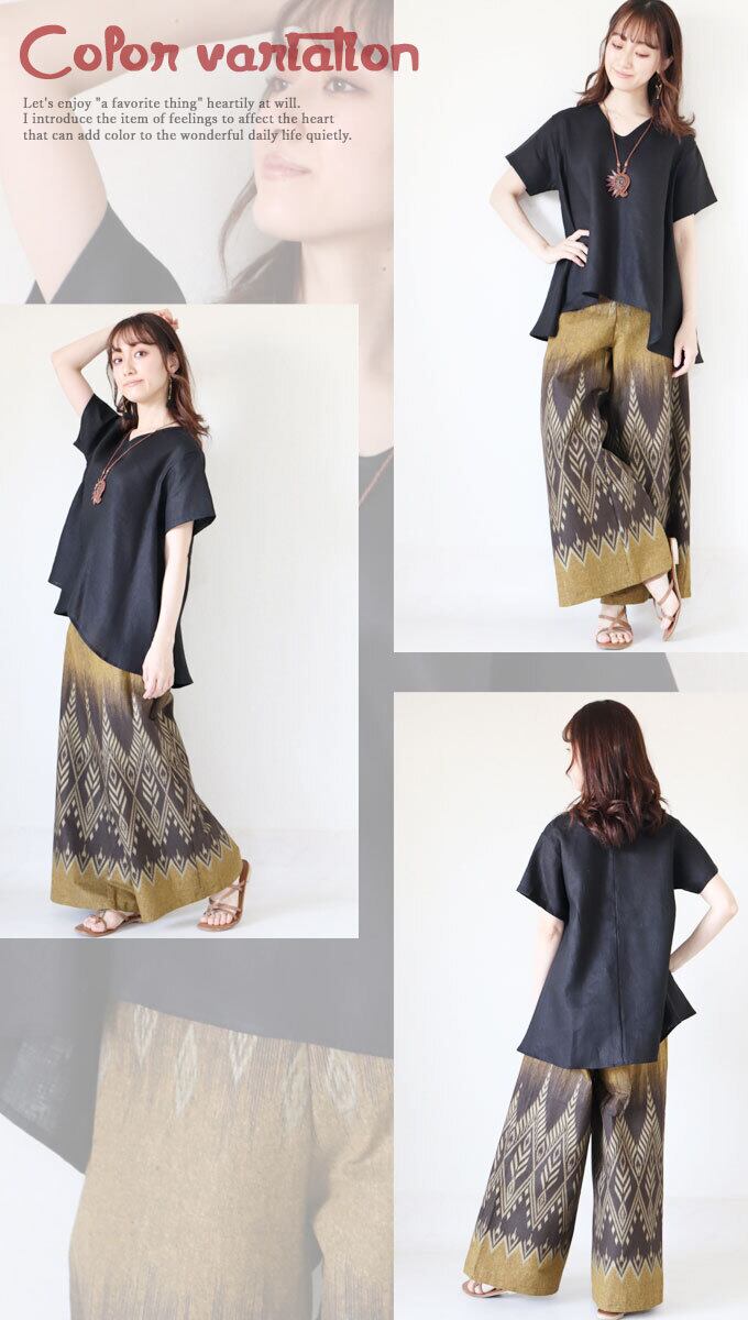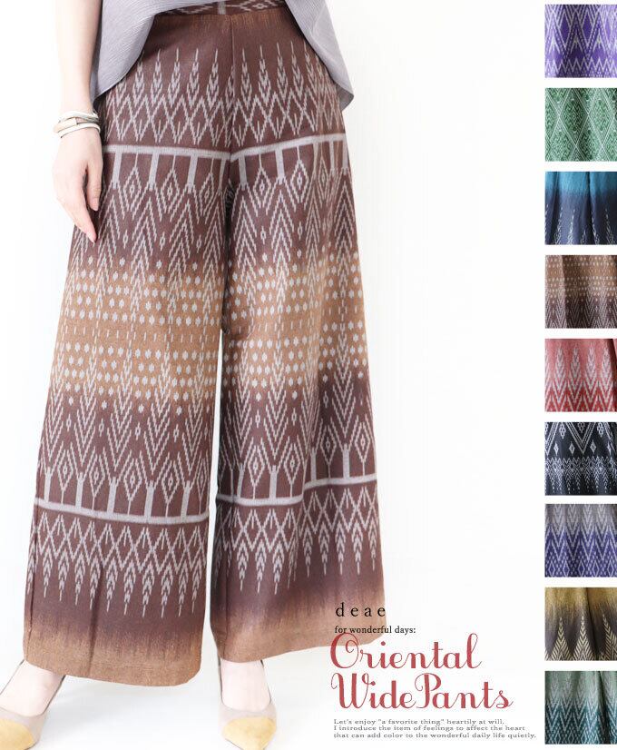 パンツ ワイド フレア レディース 夏 春 秋 ファッション エスニック イカット柄 オリエンタル きれいめ 奇麗め 上品 カジュアル お洒落 可愛い 大人ナチュラル「シックな彩り イカット織りの柄行きで着映える 上品ワイドパンツ」dc10159