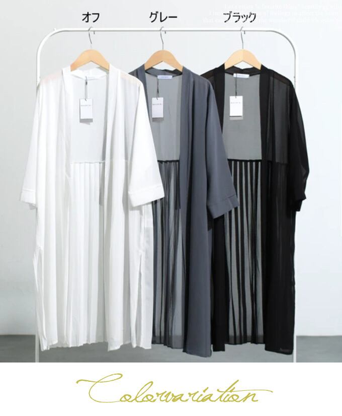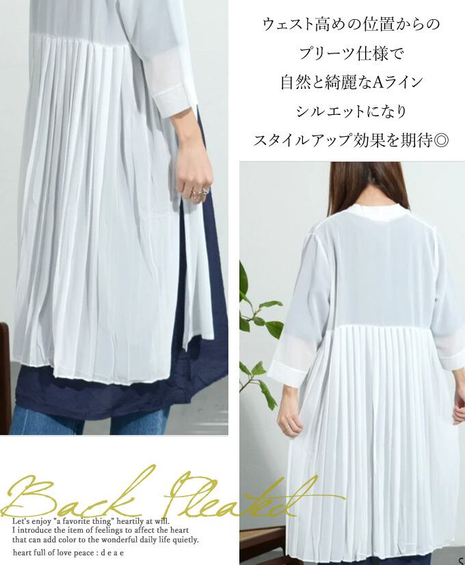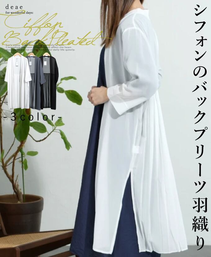【再入荷3/23】羽織り カーディガン シアー素材 シフォン 透け感 ロング丈 七分袖 サイドスリット Aライン バックプリーツ 日除け 二の腕隠し 寒暖差対策 「軽やかに揺れるバックプリーツのロング丈羽織り」da10476