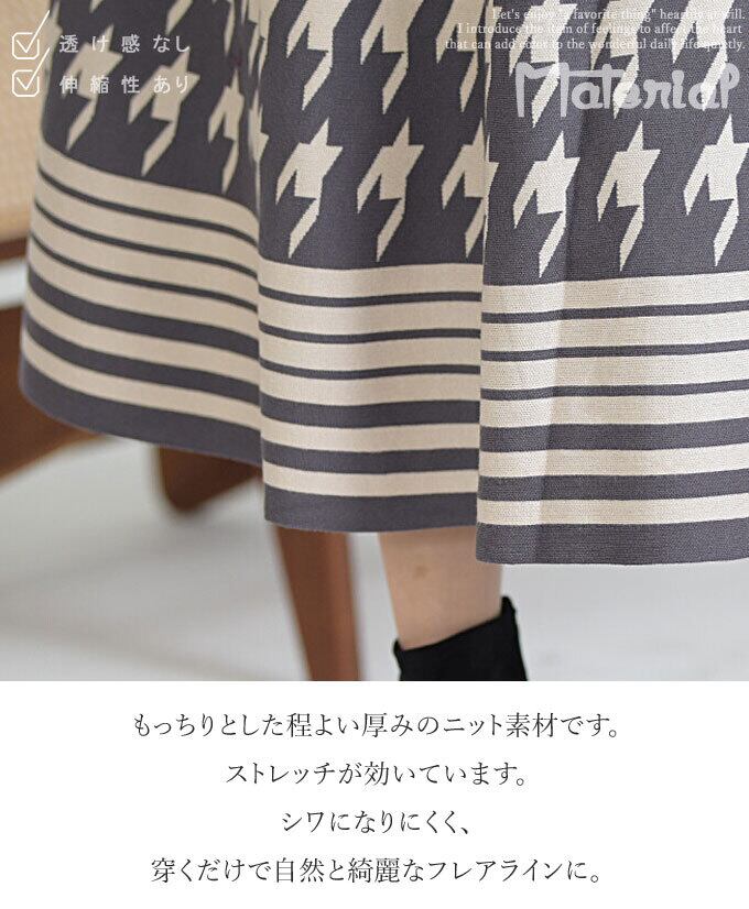 【検索ワード】 スカート フレア ニットスカート 千鳥格子 ボーダー 華やか カジュアル 綺麗め 上品「穿くだけで美シルエット 千鳥とボーダーの華やかニットスカート」エレガント ベーシック カジュアル おしゃれ オシャレ お洒落 定番 ベーシック 上品 女性らしい デザイン きれいめ キレイめ シンプル フェミニン 春 秋 春服 春物 冬 冬物 着回し レディース レディースファッション 大人 ママ ミセス S M L 小さめサイズ小さい 小さいサイズ 低身長 小柄 細身 標準サイズ 大きめシルエット 大きめサイズ 大きめ 大きい ゆったり 綺麗め カジュアル 30代 40代 50代 60代 ニット フレアスカート ブラック グレー アイボリー ベージュ