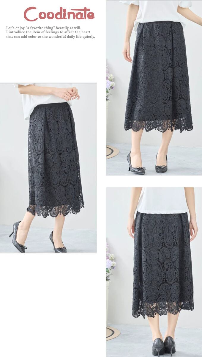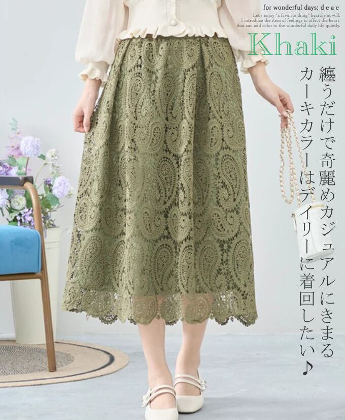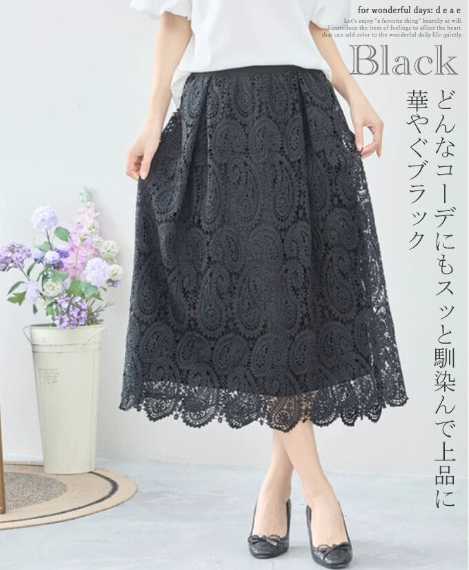 【検索ワード】スカート ロング丈 レーススカート ペイズリー 繊細レース フェミニン 綺麗め お洒落 上品 カジュアル レディース「上品に華やぐペイズリーのレーススカート」 エレガント ベーシック カジュアル おしゃれ オシャレ お洒落 定番 ベーシック 上品 女性らしい デザイン きれいめ キレイめ シンプル フェミニン 春 秋 春服 春物 着回し レディース レディースファッション 大人 ママ ミセス S M L 小さめサイズ小さい 小さいサイズ 低身長 小柄 細身 標準サイズ 大きめシルエット 大きめサイズ 大きめ 大きい ゆったり 綺麗め カジュアル ブラック カーキ ブラウン アイボリー 30代 40代 50代 60代 レース スカート ブラック ベージュ アイボリー カーキグリーン