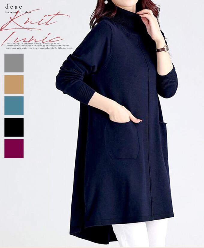 ニット チュニック 長袖 プルオーバー 後ろ下がり ラウンドヘム ハイネック レディース 秋 冬 ファッション カジュアル 綺麗め 上品 お洒落「暖かくお洒落を愉しむなら ヒップまですっぽり隠れるもっちりニットのチュニックトップス」da10458