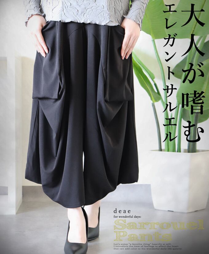 【検索ワード】パンツ サルエルパンツ モード ブラック 黒 シルエットパンツ ゆったり お洒落 上品 カジュアル レディース ストレッチ ウェストゴム「大人が嗜む エレガントなサルエルパンツ」 ベーシック カジュアル おしゃれ オシャレ お洒落 定番 ベーシック 上品 女性らしい デザイン きれいめ キレイめ シンプル フェミニン 春 秋 春服 春物 着回し レディース レディースファッション 大人 ママ ミセス S M L 小さめサイズ小さい 小さいサイズ 低身長 小柄 細身 標準サイズ 大きめシルエット 大きめサイズ 大きめ 大きい ゆったり 綺麗め カジュアル 30代 40代 50代 60代 サルエルパンツ 大人モード カッコいい お洒落 綺麗め