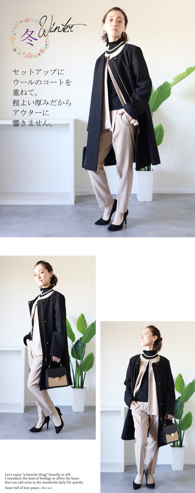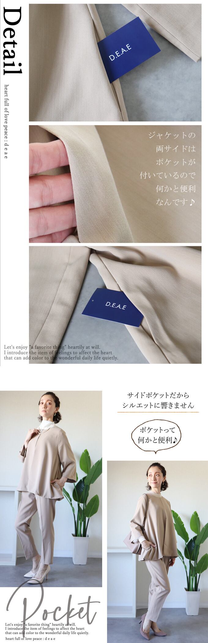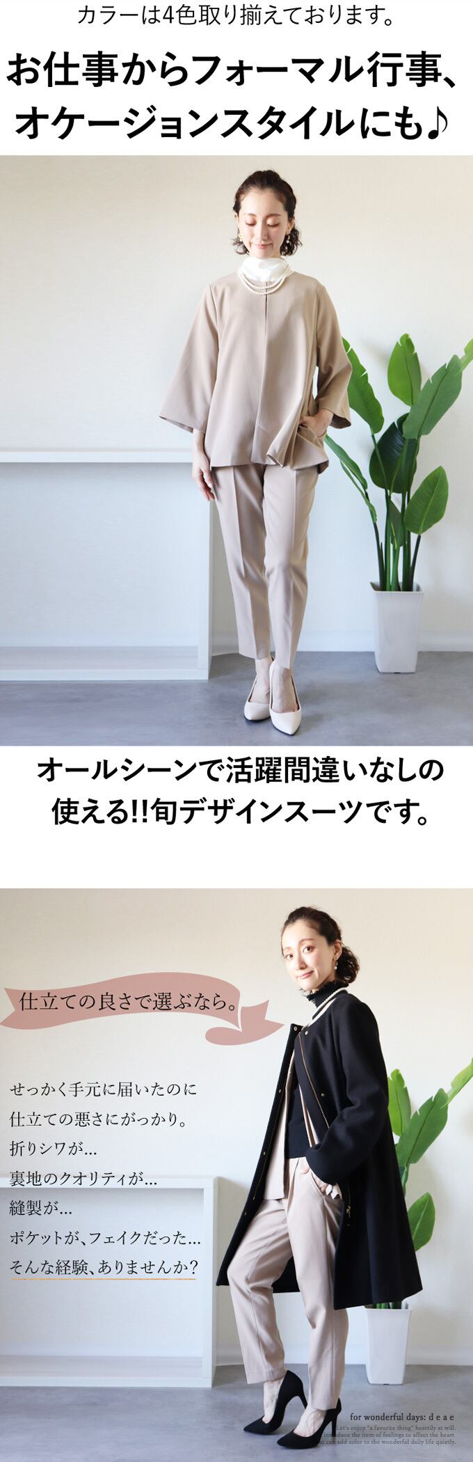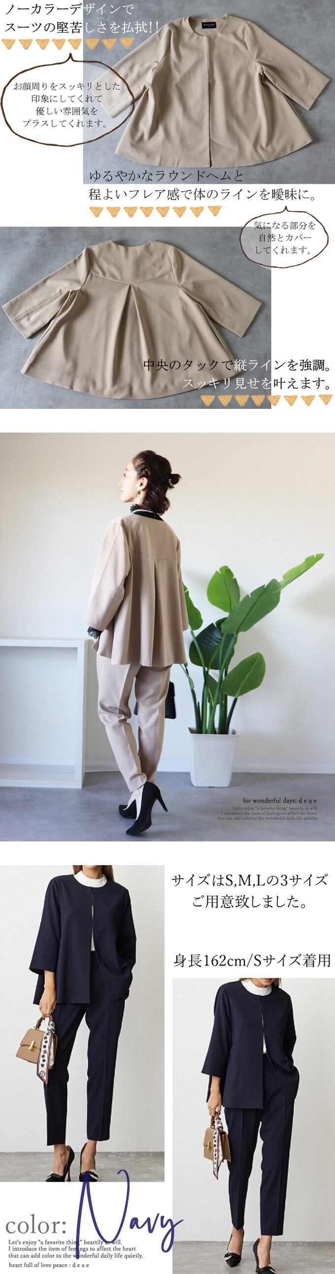 【検索ワード】入学式、入園式、卒業式、卒園式、2次会(二次会)、同窓会、演奏会、披露宴、発表会、学校行事、参観日、七五三、お宮参り、セレモニー、謝恩会、誕生日会、お呼ばれ、女子会、食事会、成人式、パーティー、デート、オフィス、ビジネススーツ、キャリア、通勤、20代・30代・40代・50代 スーツ レディース フォーマル 大きいサイズ かっこいい セットアップ オケージョン ノーカラー 春 夏 秋 冬 オールシーズン ベージュ ブラック ピンク ネイビー テーパードパンツ センターライン 「納得スーツ~お仕事もフォーマルも~」 エレガント ベーシック カジュアル おしゃれ オシャレ お洒落 定番 ベーシック 上品 女性らしい デザイン ナチュラル きれいめ キレイめ シンプル フェミニン 春 夏 秋 春服 春物 夏 夏服 夏物 冬 冬物 オールシーズン 着回し レディース レディースファッション 大人 ママ ミセス S M L 小さめサイズ小さい 小さいサイズ 低身長 小柄 細身 標準サイズ 大きめシルエット 大きめサイズ 大きめ 大きい ゆったり 7分袖フレア 綺麗め カジュアル 30代 40代 50代 60代 オケージョン フォーマル スーツ ハイクオリティー ハイグレード 百貨店品質 高品質 上品 仕立てが綺麗