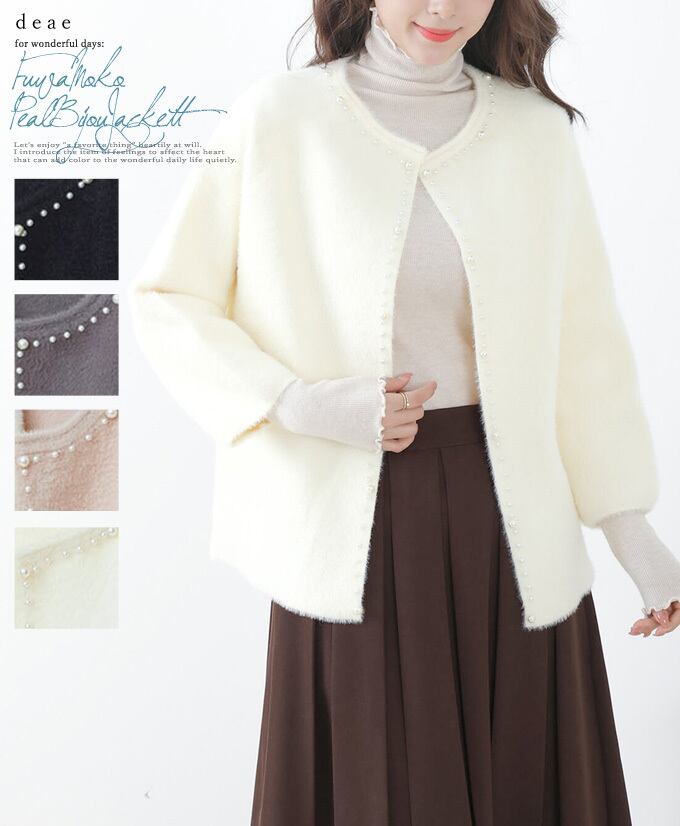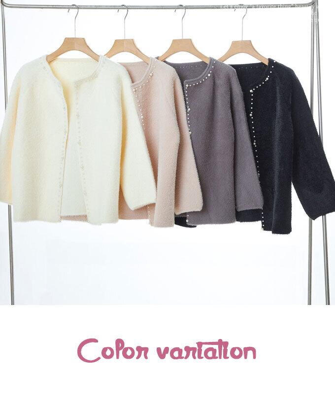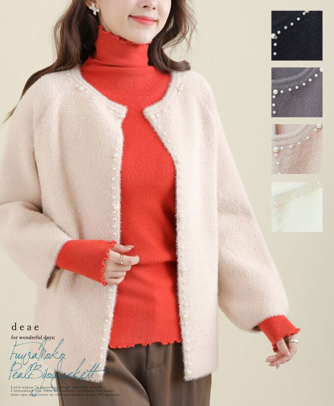 アウター ジャケット 羽織り ふわふわ もこもこ 起毛 ニット 長袖 パールビジュー カジュアル 綺麗め レディース ファッション「凛と並んだ煌めくパールビジューのふわもこニット羽織り」da10182