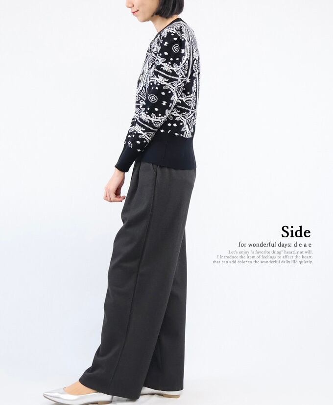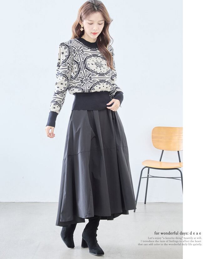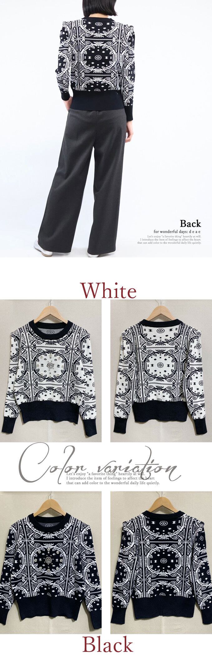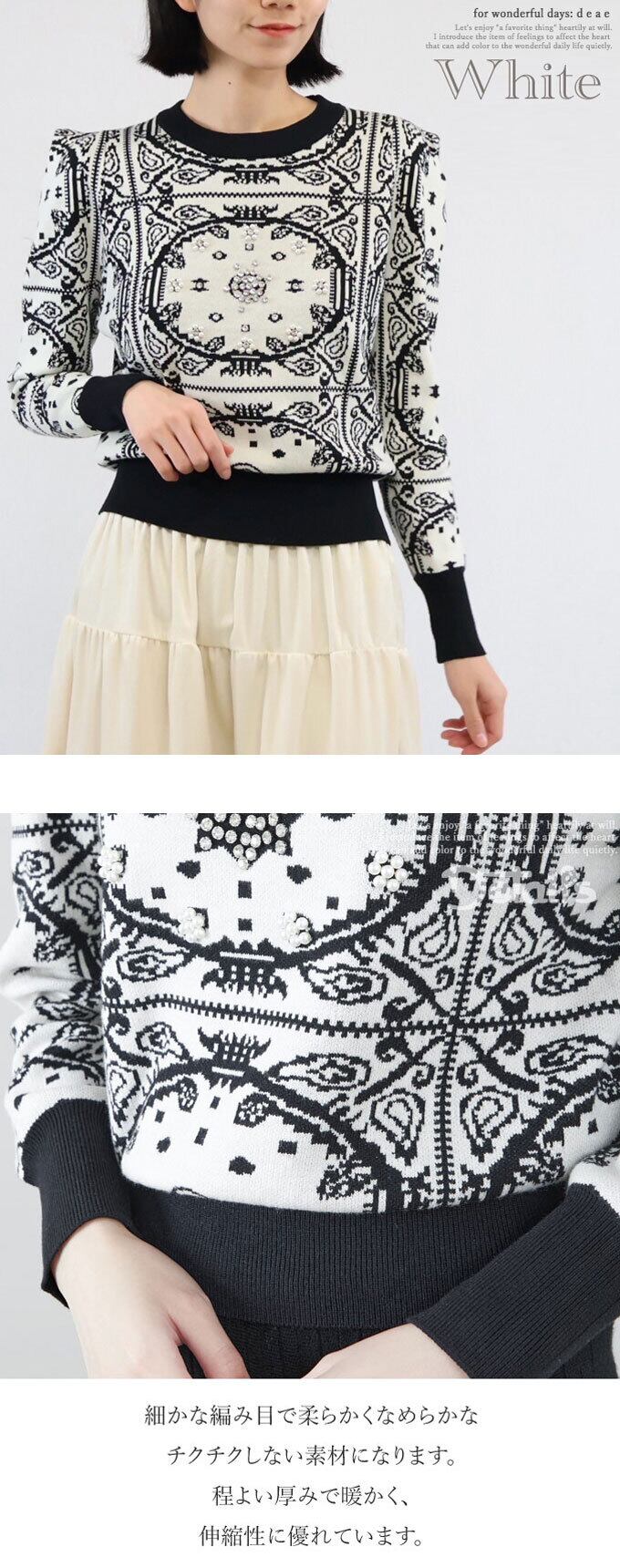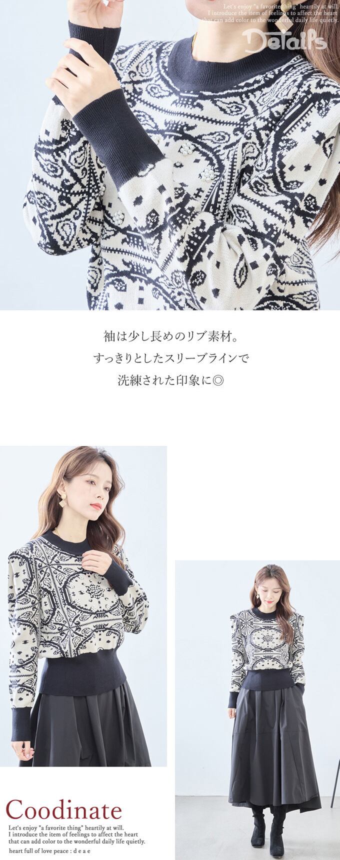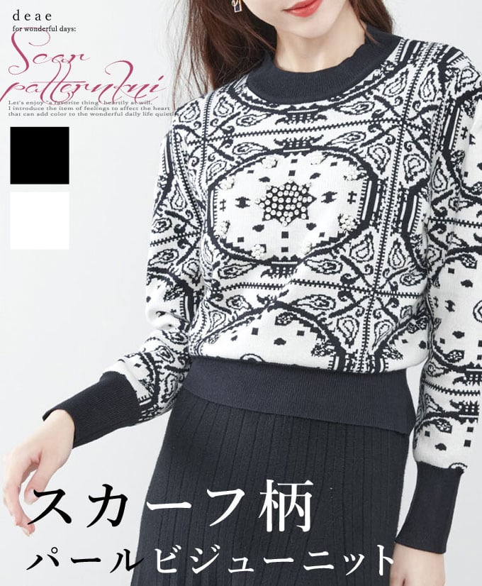 【新色追加】ニット セーター 長袖 レディース スカーフ柄 ビジュー装飾 パールビジュー 上品 華やか フェミニン お洒落 スッキリシルエット「お洒落なスカーフ柄と煌めくパールビジューのニットプルオーバー」da10303