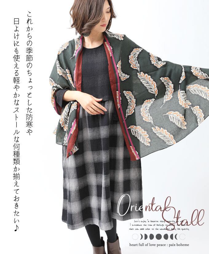 ストール【グリーン】DEAE オリエンタルな羽ストール。エスニック。薄手。pb805