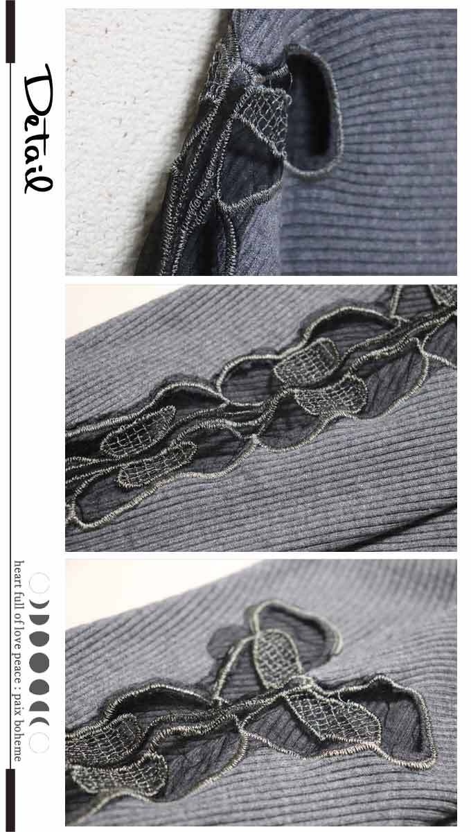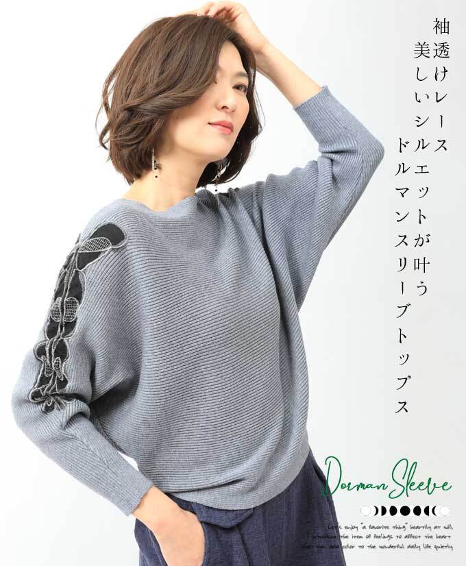 トップス【グレー】DEAE 袖透けレース ドルマントップス リブニット /上品/着回し/綺麗なシルエット/pb622