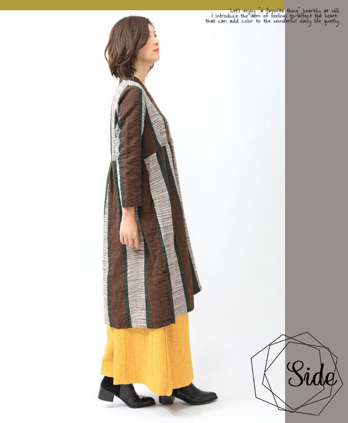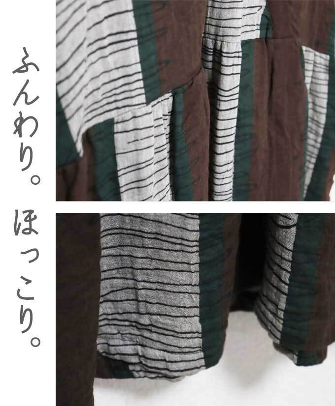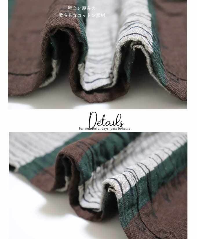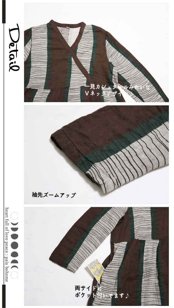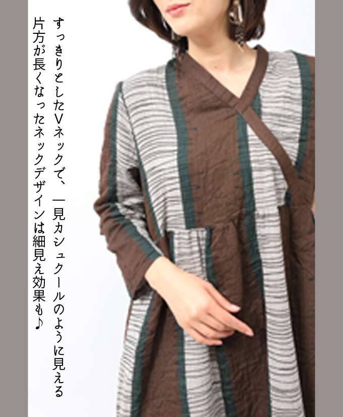 ワンピース【ブラウン×グリーン】DEAE 手描きストライプのカシュクール風ナチュラルワンピース/ストライプ/ナチュラル/pb540