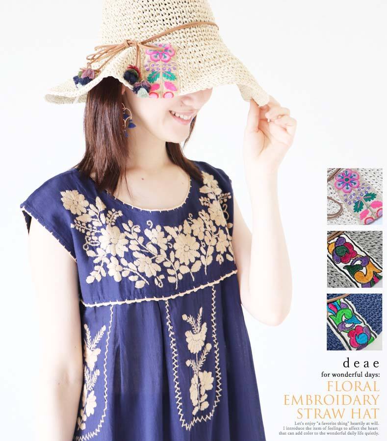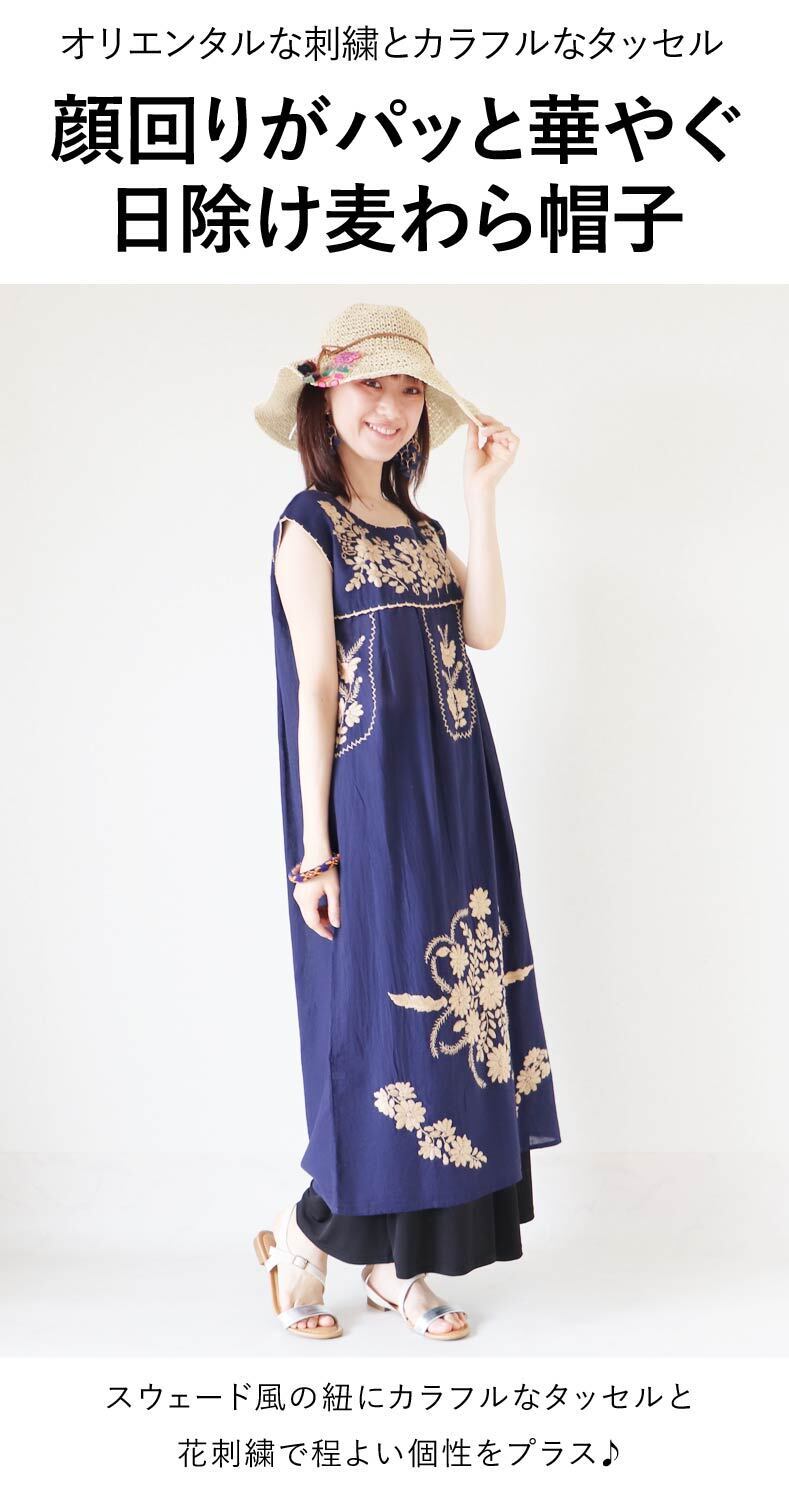 帽子 麦わら タッセル 日除け ワイヤー入り オリエンタル 刺繍 レディース ファッション ネイビー ベージュ グレー 大人 ナチュラル カジュアル お洒落 可愛い 「オリエンタル刺繍とカラフルなタッセルの日除け麦わら帽子」dz10110