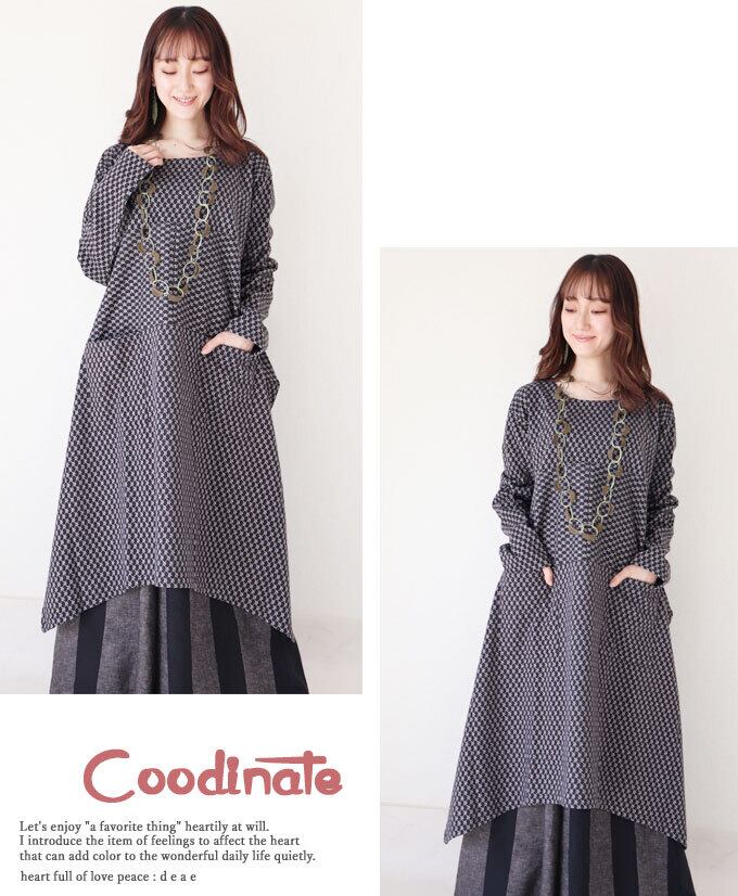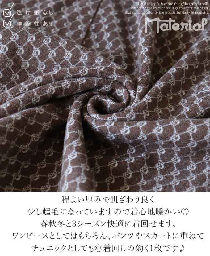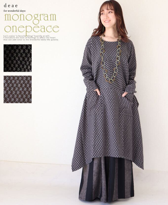 【再入荷11/1】ワンピース チュニック 長袖 モノグラム アシンメトリー レディース ファッション ブラック ブラウン 大人ナチュラル カジュアル お洒落 可愛い 上品 華やか オシャレ 「モノグラム柄大人ナチュラルに着映える 上品チュニックワンピース」db10128