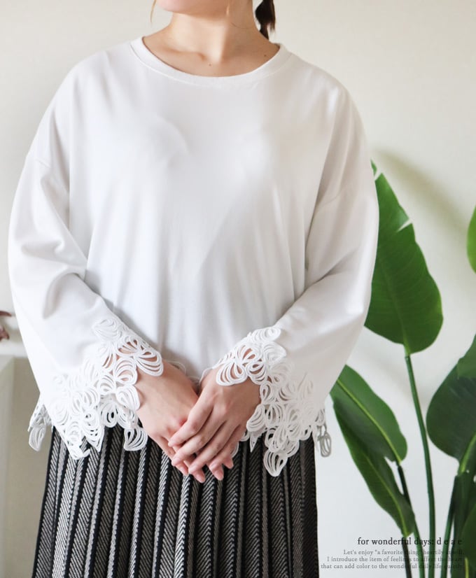 レース カットソー 裾レース 幅広レース 華やか フェミニン 上品 着回し 長袖 レディース 春 夏 秋 冬 オールシーズン ファッション カジュアル 綺麗め「日常にフェミニンな華やぎをプラスしてくれる 裾レースカットソー」da10517