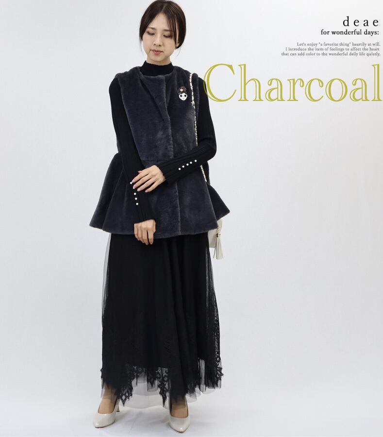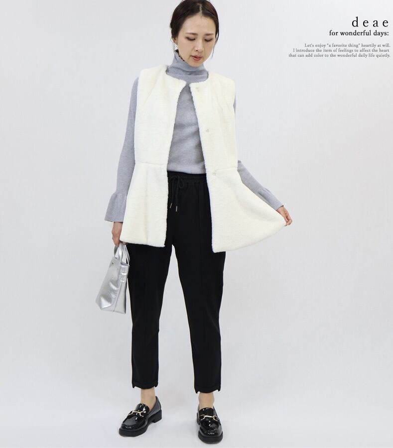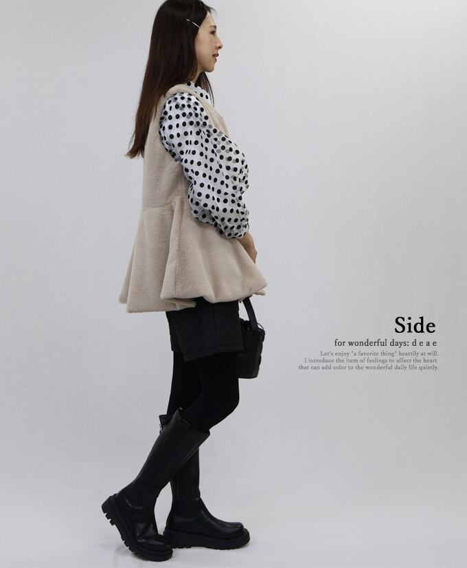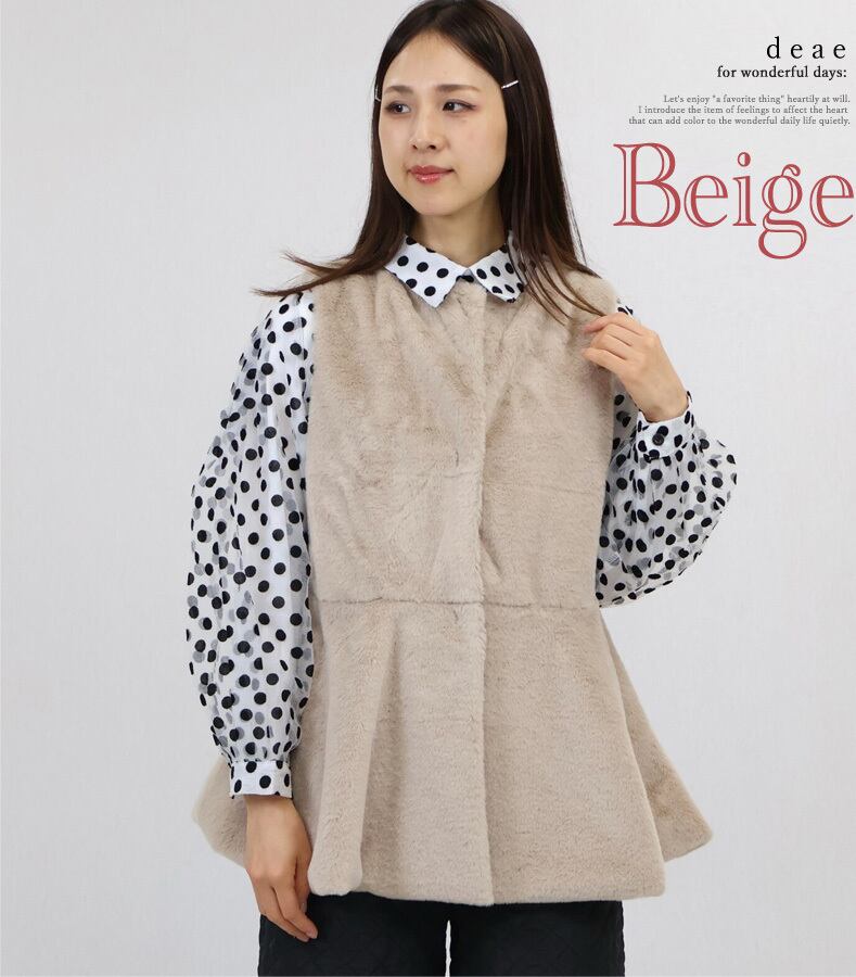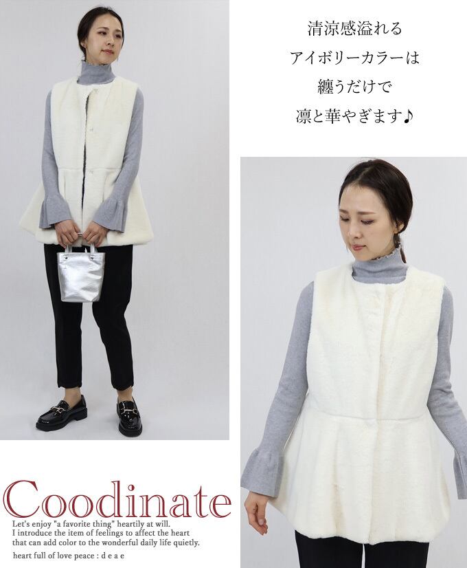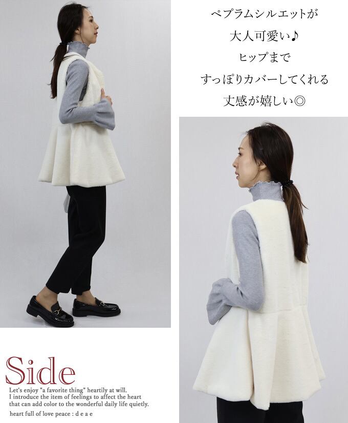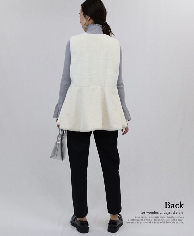 【再入荷10/20】ふわふわ フェイクファー ベスト ペプラム フレア チュニック丈 上品 綺麗め カジュアル フォーマル オケージョン お洒落「ヒップまですっぽり隠れる 上品フェイクファーのふんわりベスト」da10301