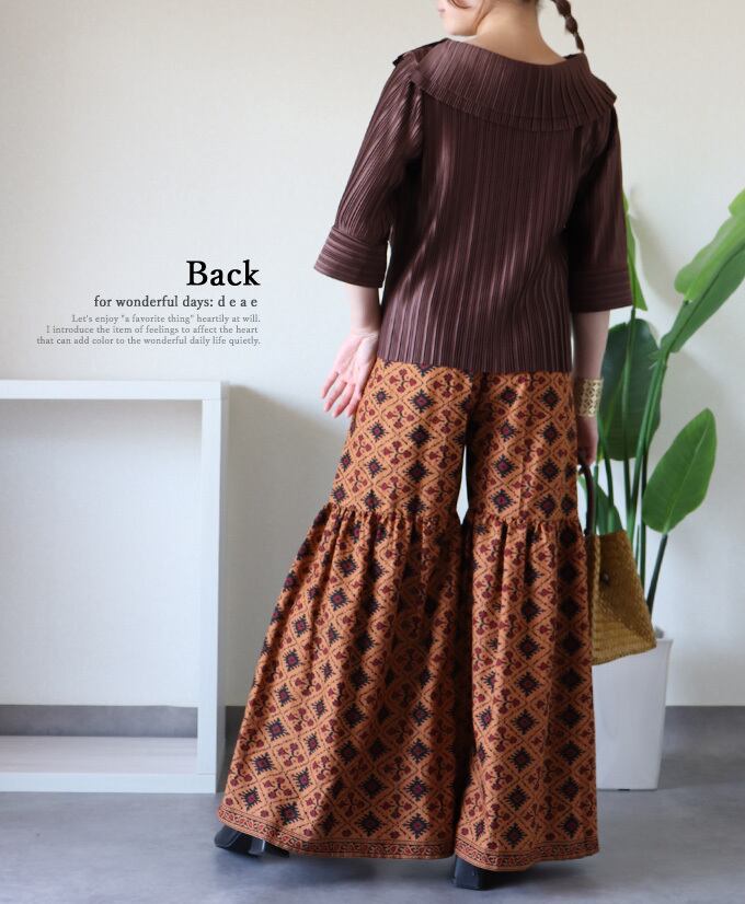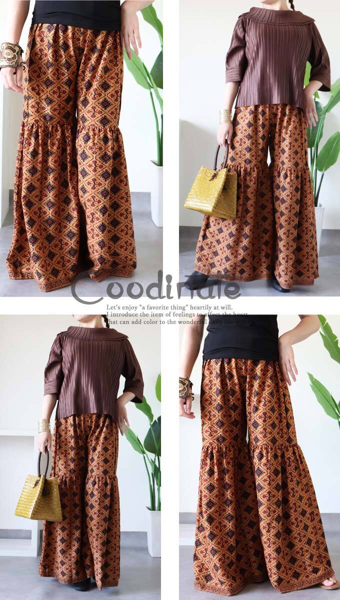 パンツ フレアパンツ ワイドパンツ イカット風 総柄 ボヘミアン アジアンテイスト レディース 夏 春 秋 ファッション オリエンタル エスニック カジュアル「オリエンタルな風吹く イカット風フレアパンツ」dc10295