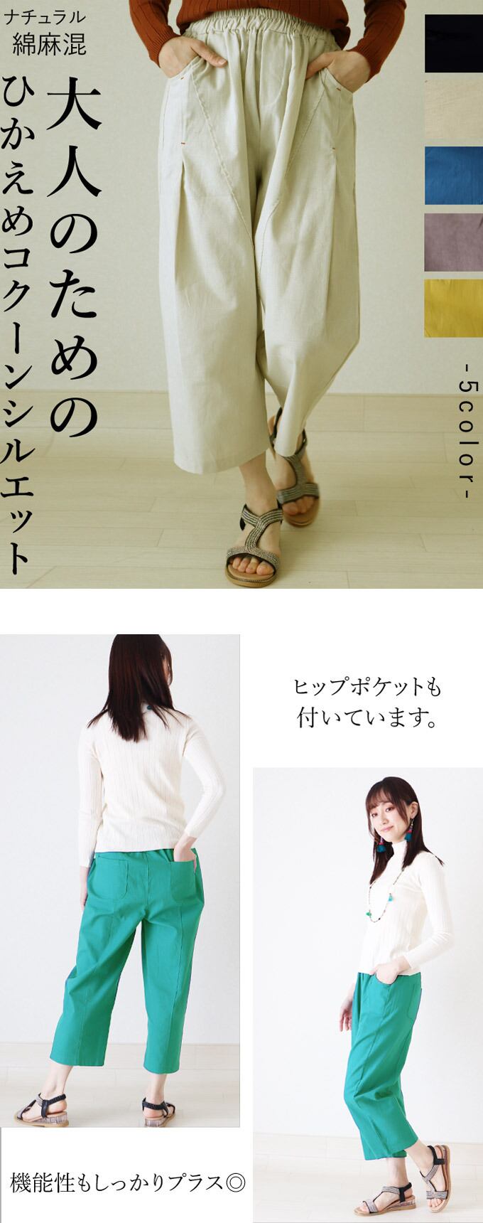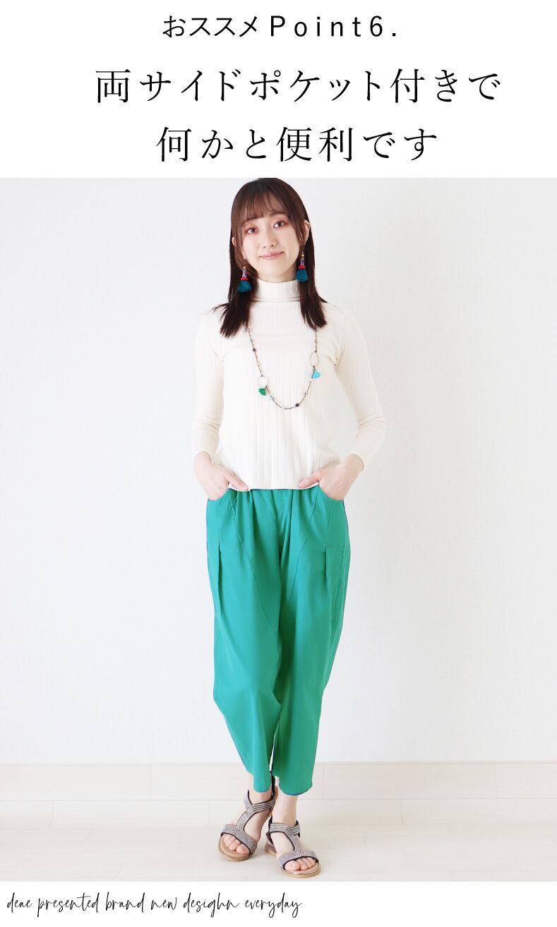 パンツ レディース 夏 春 秋 ファッション コクーンパンツ カジュアル お洒落 可愛い 着回し オシャレ 黒 オフホワイト イエロー グレー 水色「ナチュラルな風合い 綿麻 大人のための ひかえめコクーンシルエット」dc10107