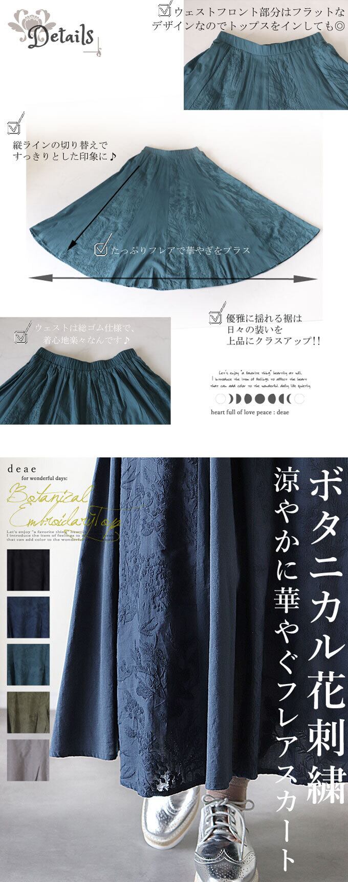 フレアスカート ロングスカート 花柄 レディース スカート ロング丈 フレア ボタニカル 草花刺繍 春 夏 秋 カジュアル 綺麗め ブラック ネイビー ブルーグリーン カーキグリーン グレー 上品 大人ナチュラル「ぷっくりボタニカル柄 上品に華やぐ草花の総刺繍スカート」dc10183