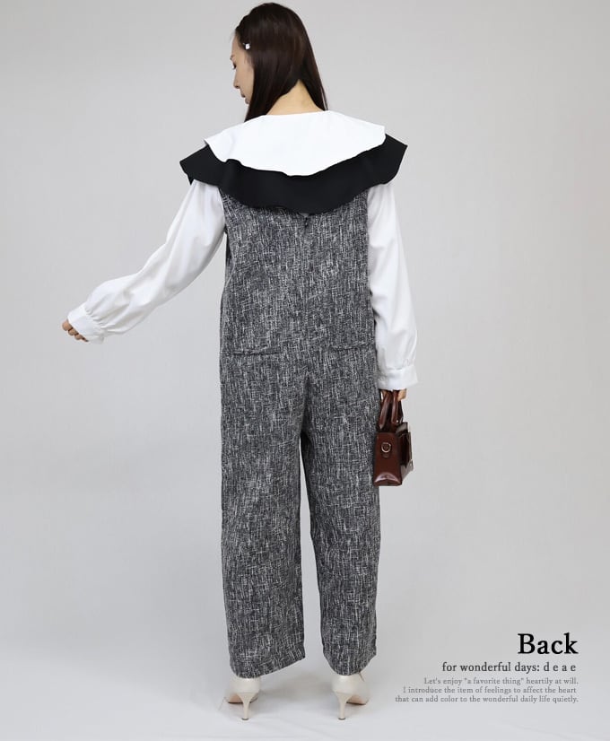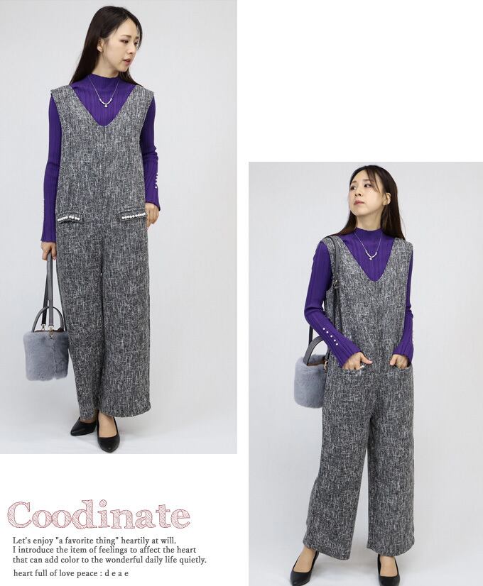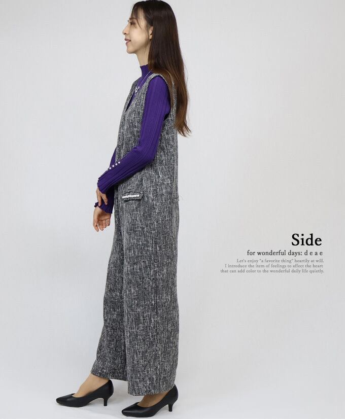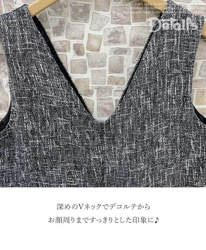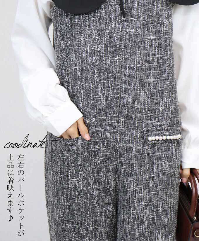 ツイード パールビジュー ポケット サロペット Vネック お洒落 上品 綺麗め ノースリーブ レディース カジュアル「上品に着映える ツイードのサロペット」db10167