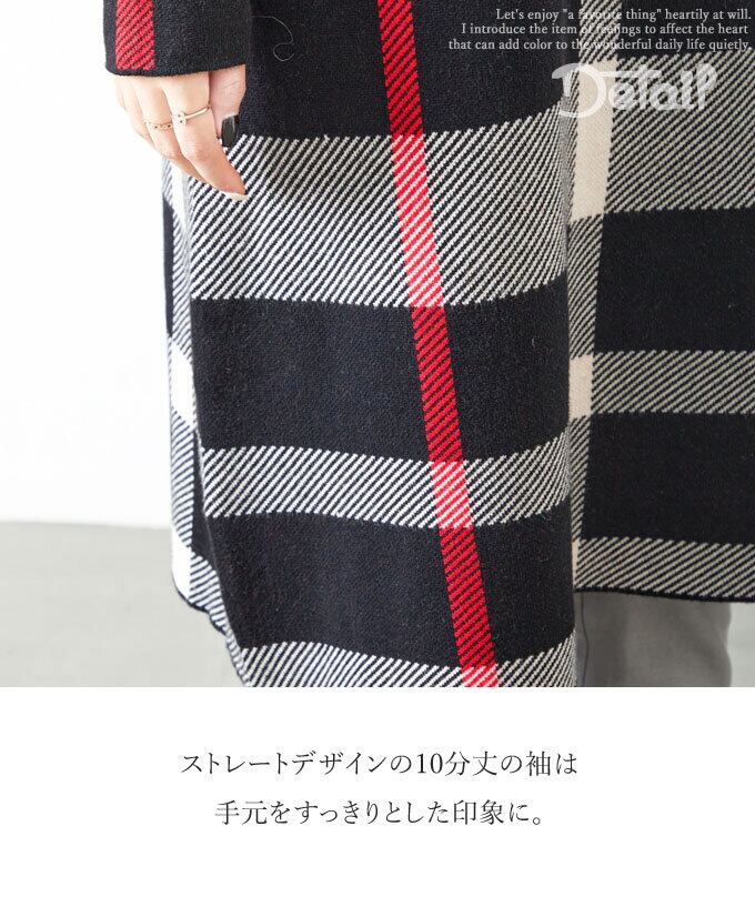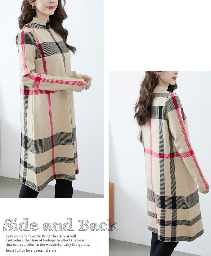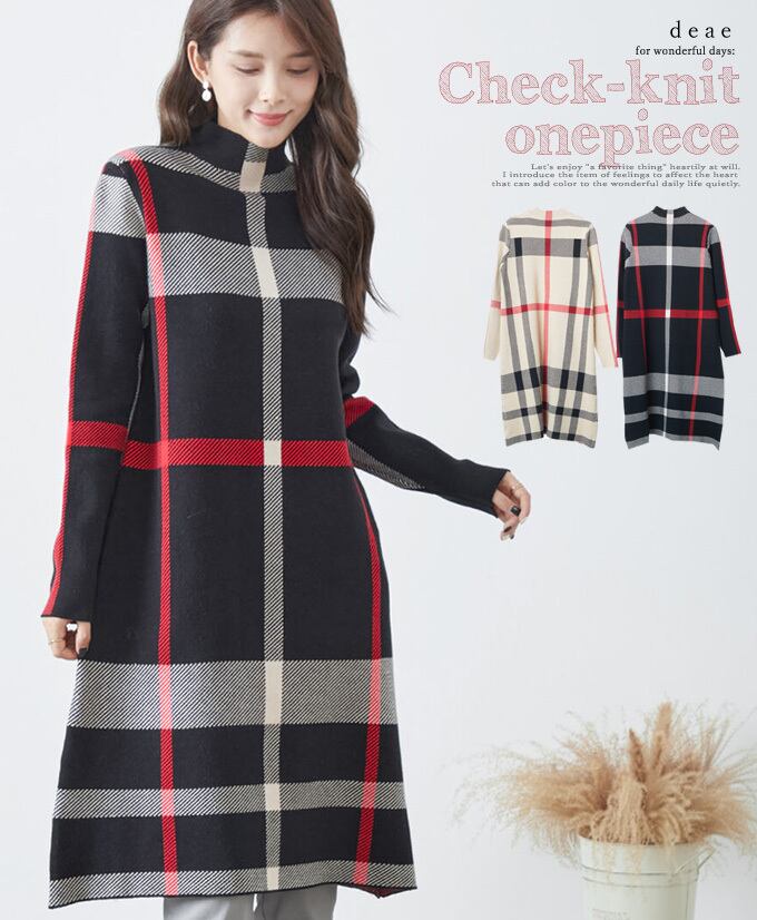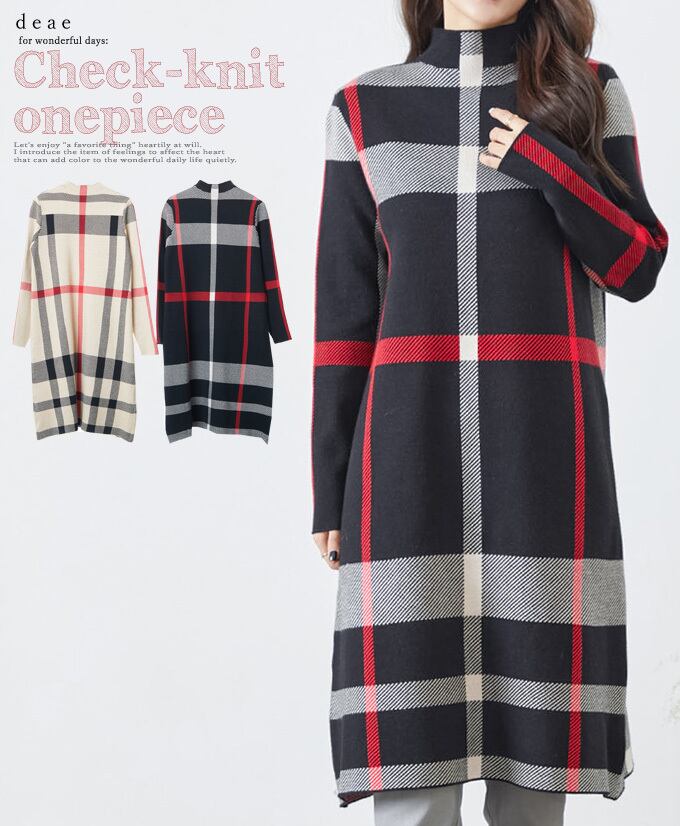 ニット ワンピース 長袖 チェック柄 Aライン モノトーン オフネック ミディアム丈 「もっちりストレッチ 大きめチェックのニットワンピース」db10155