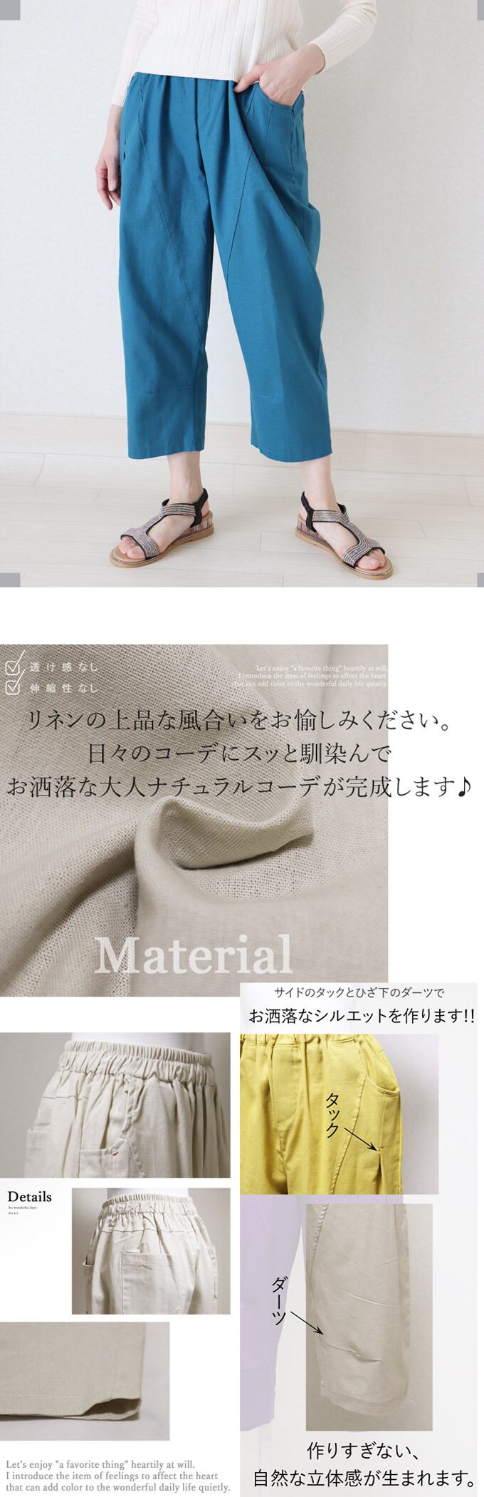 パンツ レディース 夏 春 秋 ファッション コクーンパンツ カジュアル お洒落 可愛い 着回し オシャレ 黒 オフホワイト マスタード パープル 水色「リネン100% 大人のための ひかえめコクーンシルエット」dc10107a