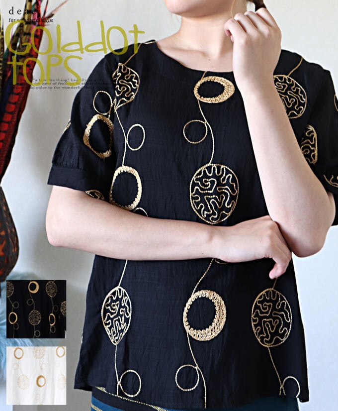 トップス 半袖 水玉 ドット 金色刺繍 レディース 春 夏 秋 ファッション 着回し カジュアル モード 大人ナチュラル「連なるドットの大人可愛いトップス」da10505
