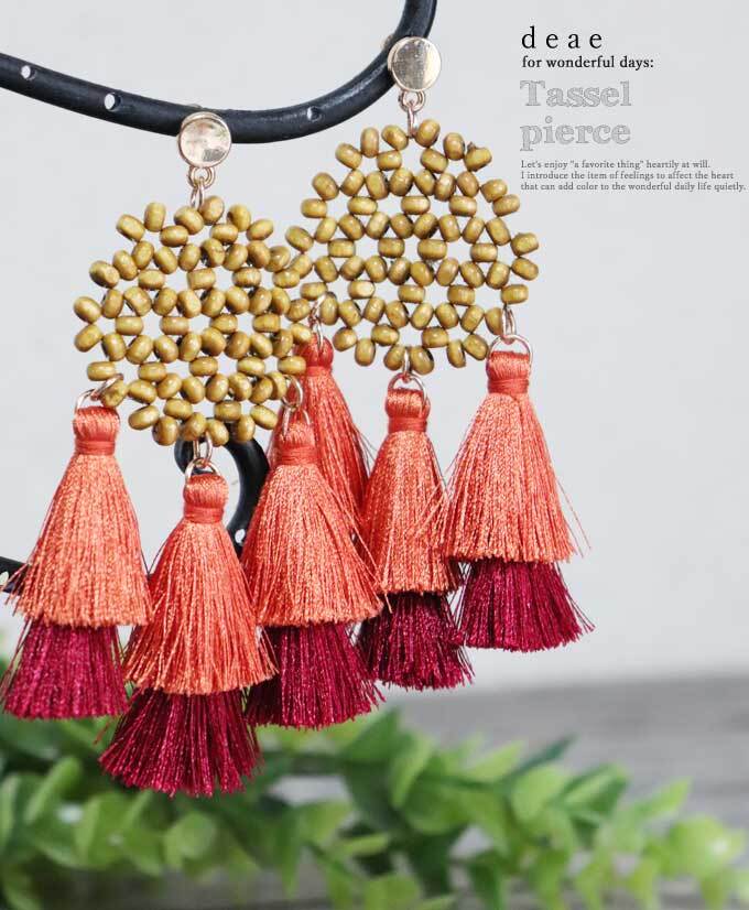 ピアス【レッド】DEAE ナチュラルな風合いの3連タッセル 大人可愛い 揺れる 差し色 フリンジ 黒de10148