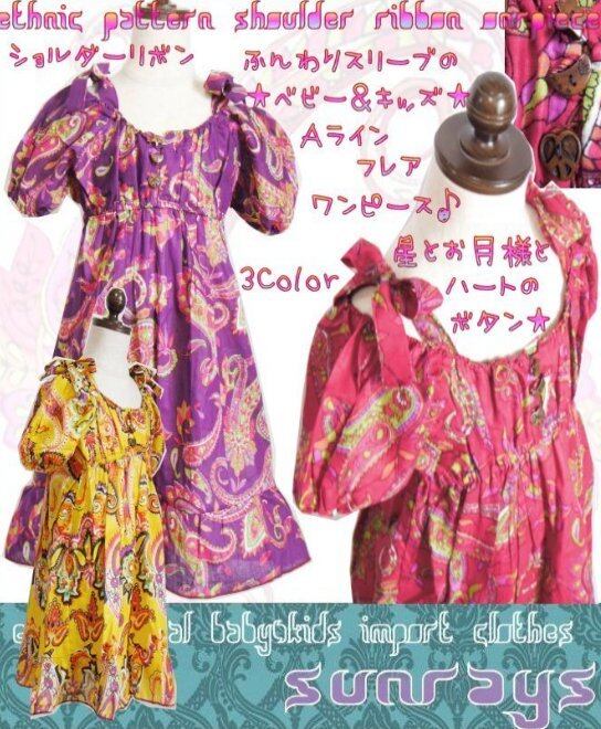 【90-120】エスニック ペイズリー柄 ワンピース フリル 肩リボン(品番sp169)【ベビー キッズ 子供服 エスニック ヒッピー アジアン】