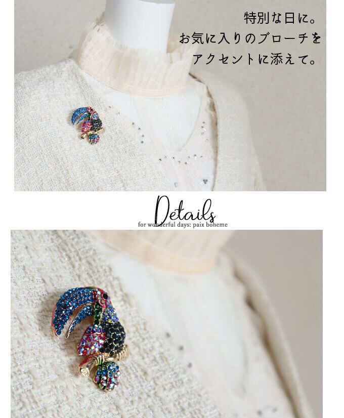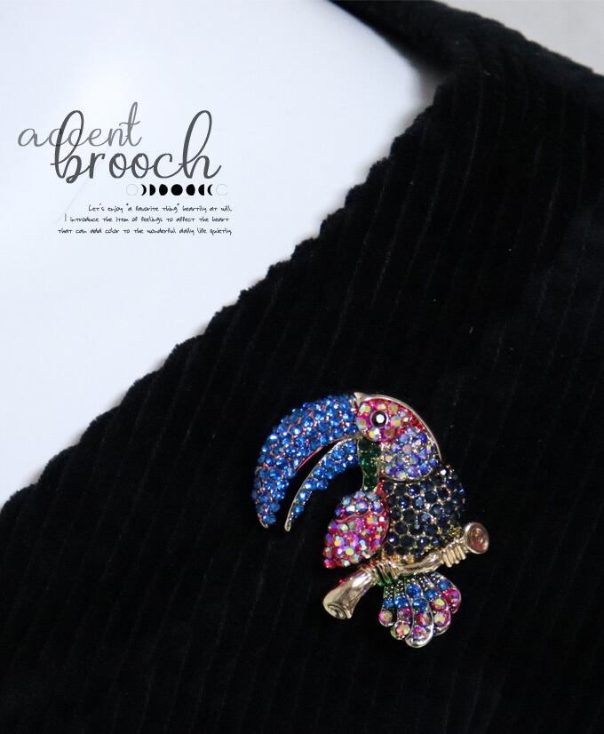 きらり南国の鳥ブローチ/差し色/北欧/煌めくブローチ/かわいいブローチ/金/ゴールド/鳥/いきものブローチ/アクセント/ビジュー/動物ブローチ/華やか/綺麗/カジュアルpb728