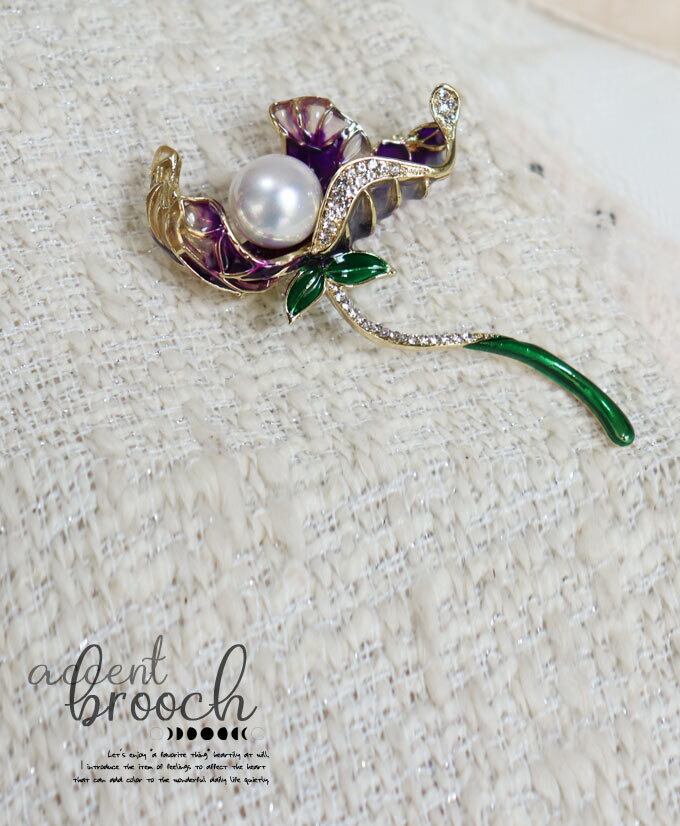 パールと蓮の花ブローチ/差し色/北欧/煌めくブローチ/かわいいブローチ/金/ゴールド/ロータス/アクセント/ビジュー/自然モチーフブローチ/植物/お洒落/カジュアル/パール/紫/パープルpb735