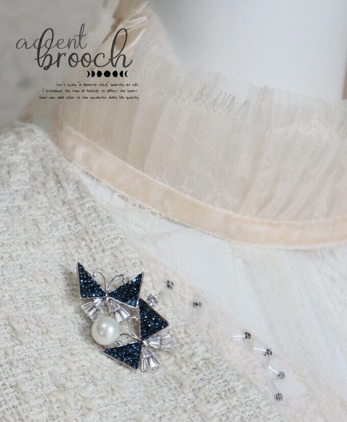 かくかく蝶々ブローチ/差し色/北欧/煌めくブローチ/かわいいブローチ/銀/シルバー/バタフライ/アクセント/ビジュー/いきものブローチ/動物ブローチ/お洒落/カジュアル/パール/ネイビー/pb737