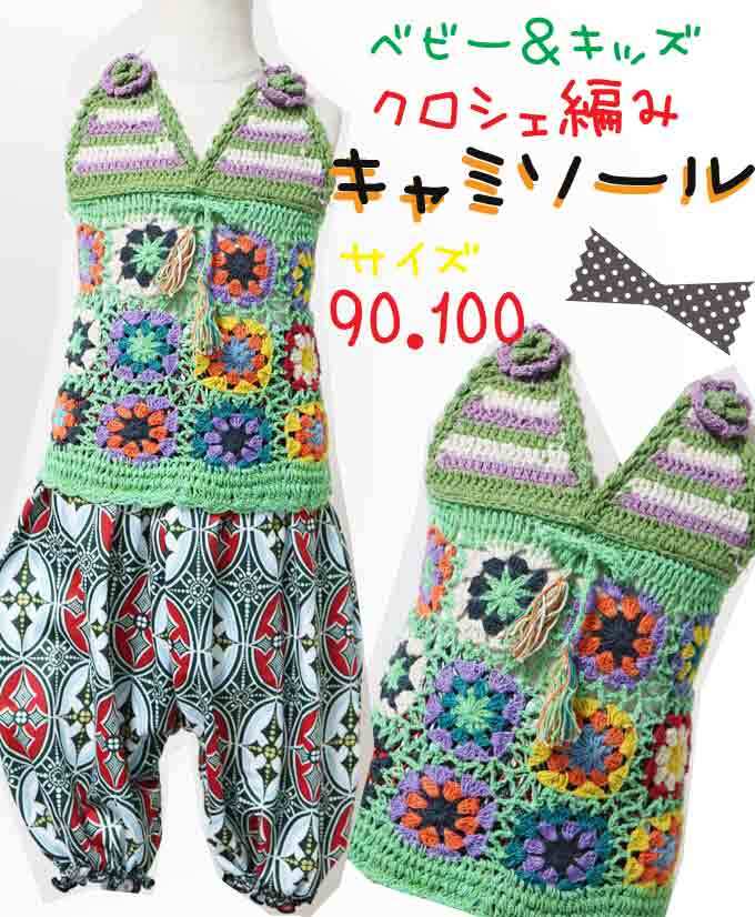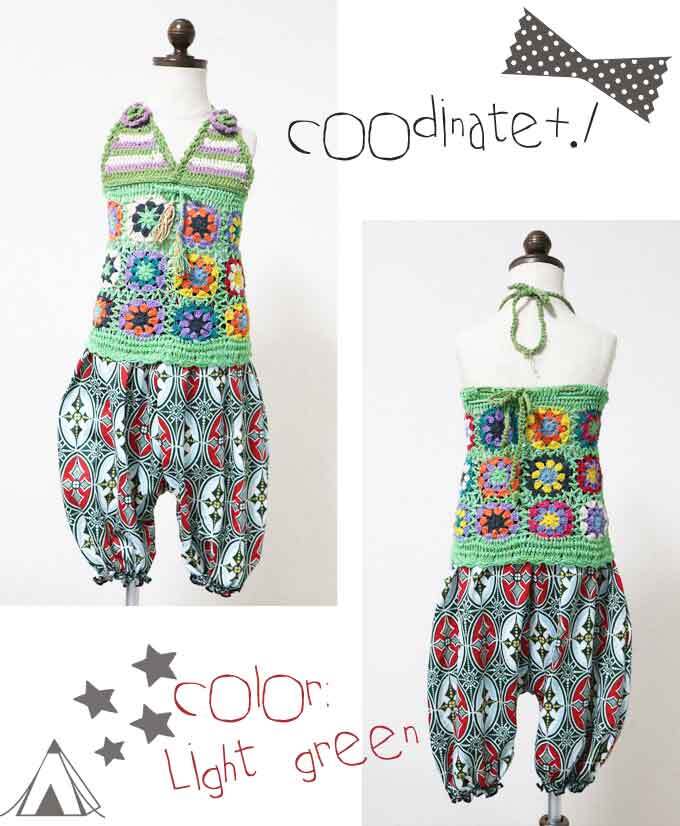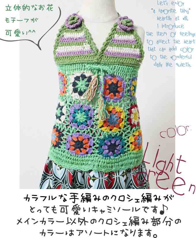 【90-100】【カラー:ライトグリーン】クロシェ編み キャミソール ナチュラル コットン 綿100(品番sp213)【ベビー キッズ 子供服 エスニック ヒッピー ナチュラル】