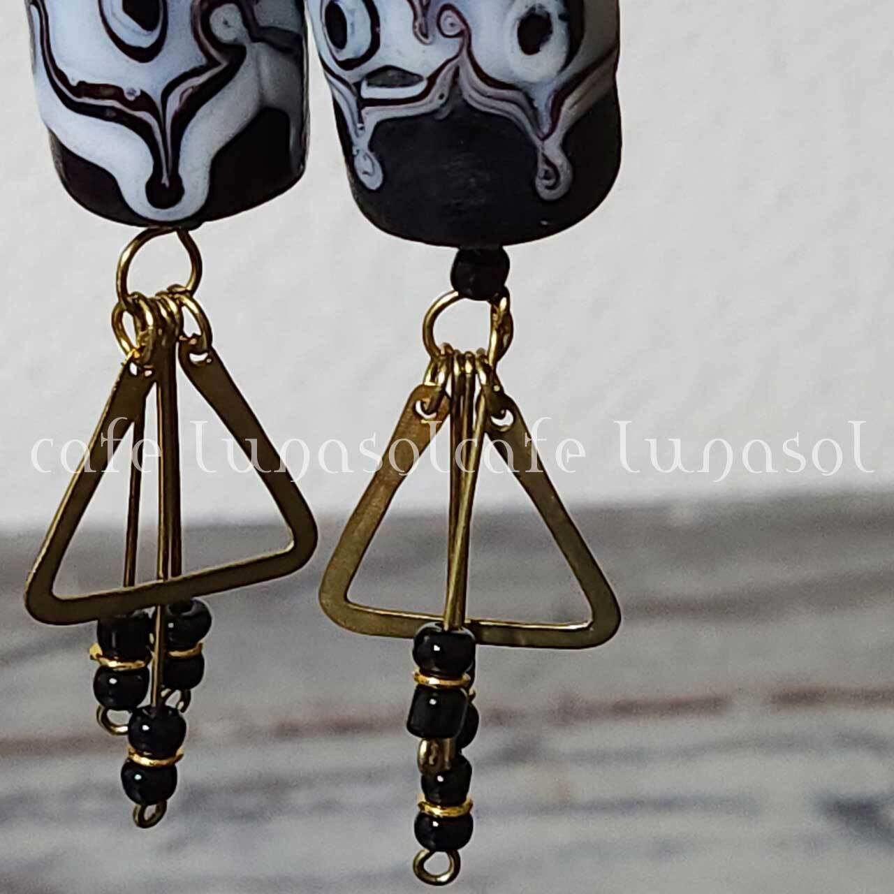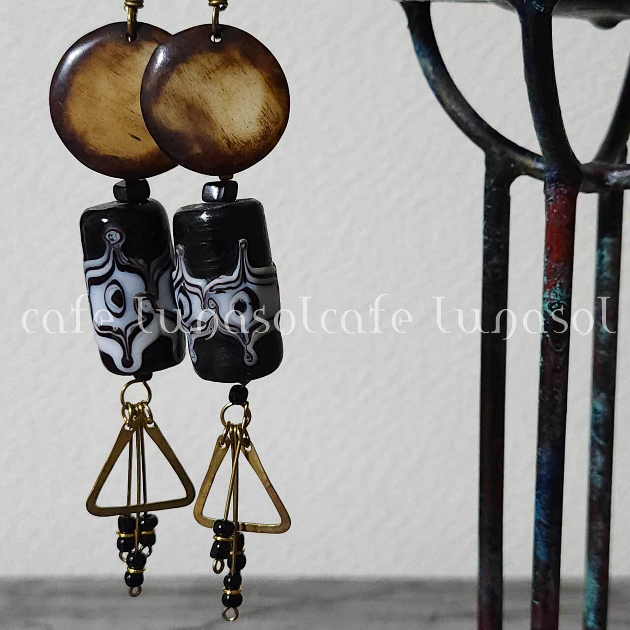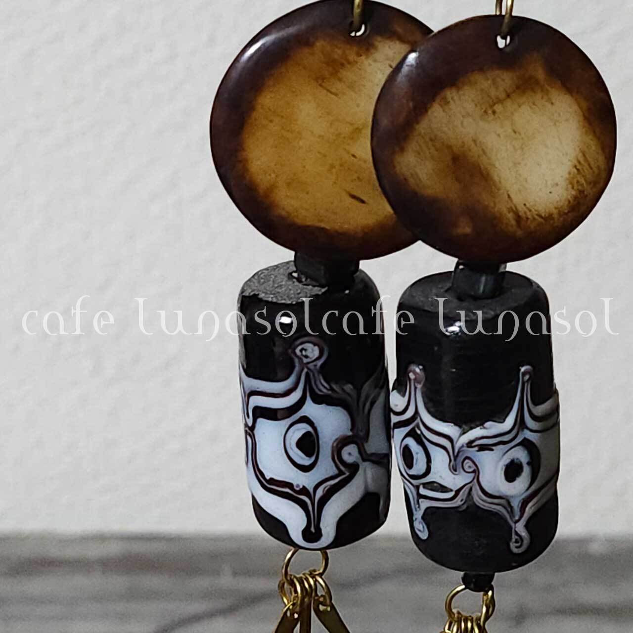 アフリカの牛骨モチーフと 筒型とんぼ玉のピアス インドネシア、ジャワのバティック柄のガラスビーズのピアス 彩り アクセント