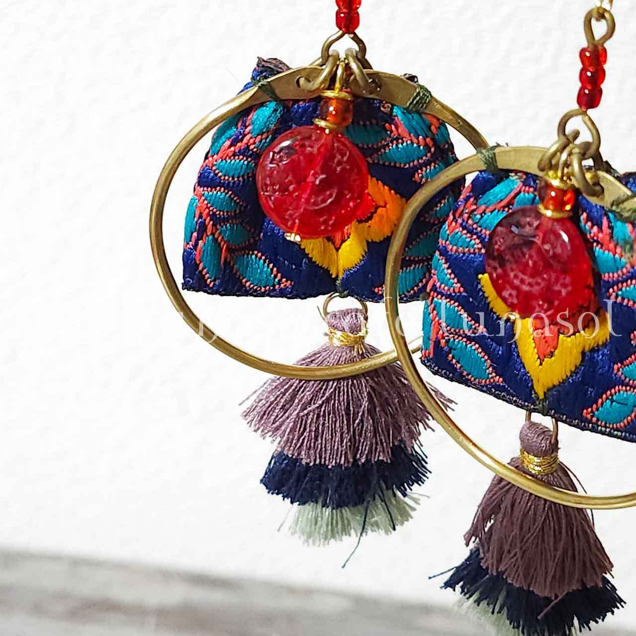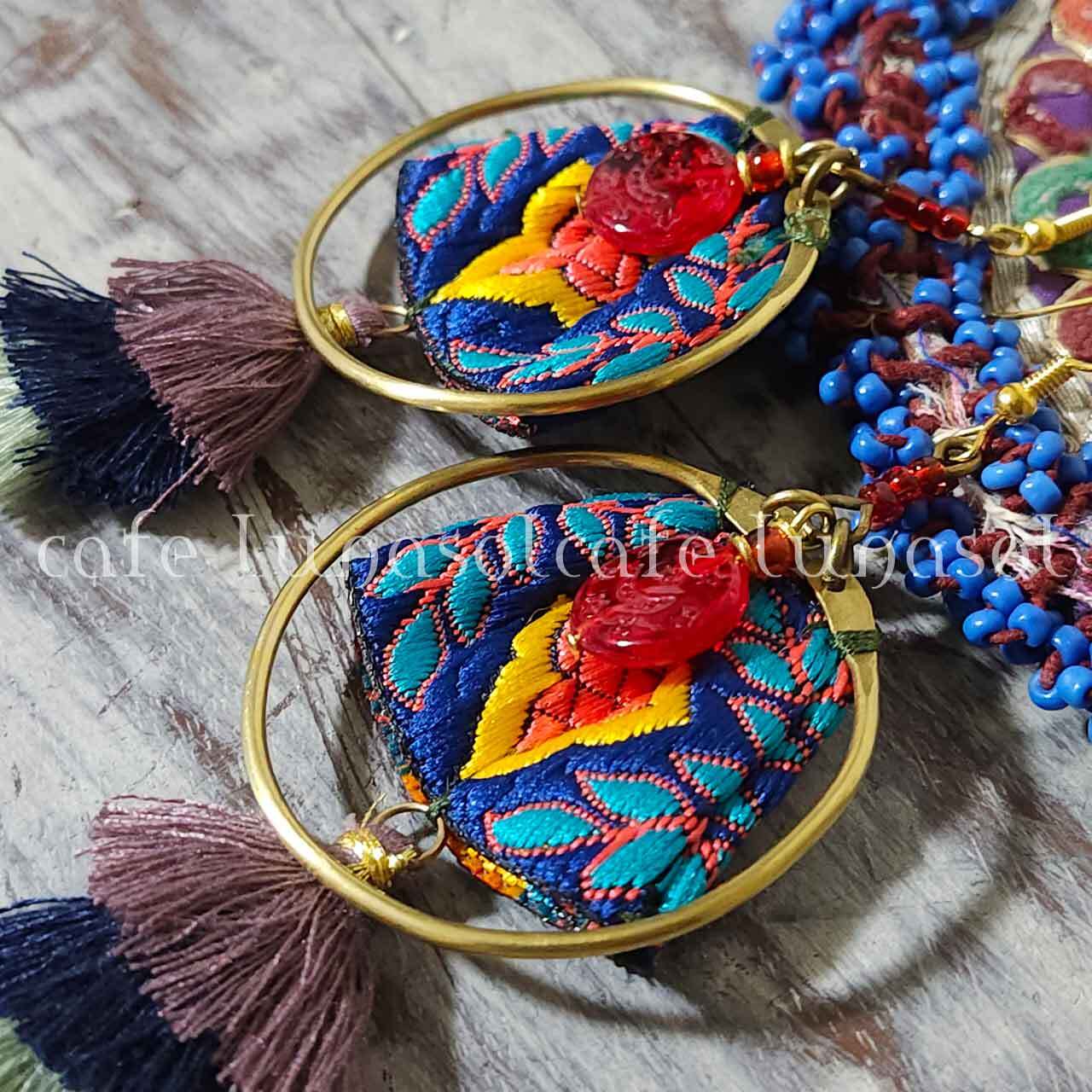 ケニアのビジューとオリエンタルな刺繍モチーフ ミックスカラーのタッセル ピアス ガラスビーズのピアス 彩り アクセント【ls0106】