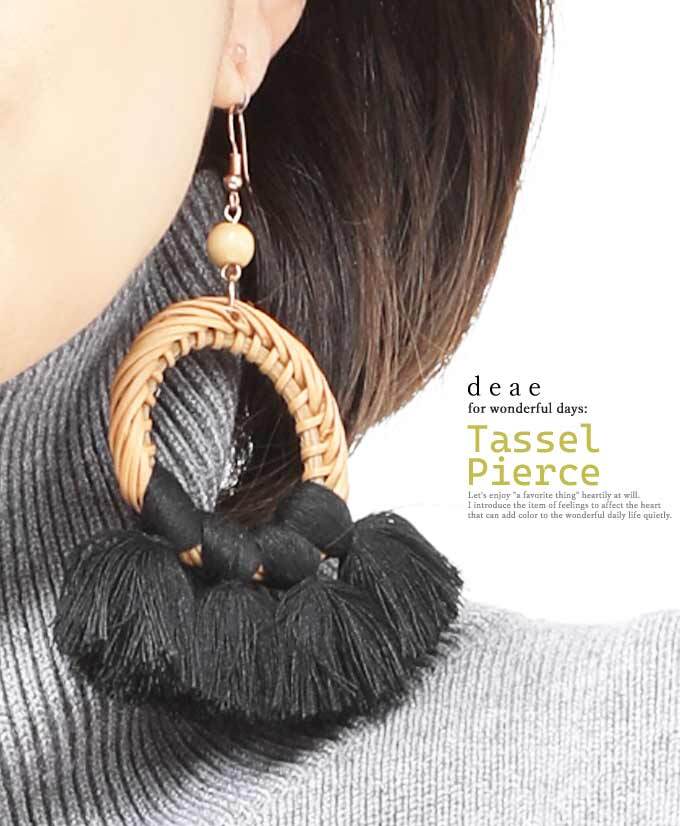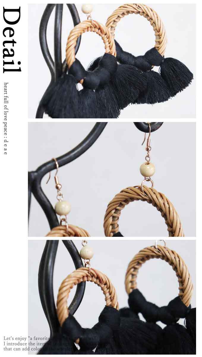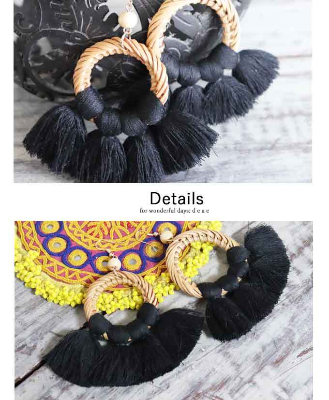 ピアス【ブラック】DEAE ぷっくりタッセルとラタンの輪ピアス 大人ナチュラル カジュアル